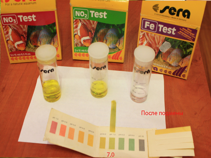 Перед подменой воды сделал тесты N02-0mg, NO3-0mg, Fe 0,01 немного розовая, СО по тесту норма.