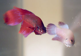 Приветствую. у меня миллион вопросов по поводу петушков. у меня аквариум всего несколько месяцев, так что знаю я мало, хоть и прочитала на тему рыбок уже много статей. Начну с главного: у меня 3 петушка, самец и 2 самочки. В зоомагазине сказали, что если взять только одну, он ее заклюет. Почти 2 месяца, они жили дружно, а сейчас одну самочку гоняет и петушок и вторая самка(которая больше размером), даже хвостик немного откусили. Хотя другие рыбки ее не трогают. Маленькая даже цвет поменяла. А самец и вторая постоянно друг за другом плавают и красуются. Сегодня я их отсадила в отдельный аквариум, подняла температуру до 29*, в одной статье по разведению сказано, что 30* надо. Сначала они друг друга гоняли, красовались, кружились(красиво было). Потом показалось, что самец ее уже достал, но заметила, что она сама к нему лезет, жабры растопырит и плывет к нему. Брюшка у обеих самочек кругленькие и белая крупинка перед анальным плавником(яйцеклад) появились. Правда не могу понять, что за поперечные полосы на теле у них должны появиться.  и вообще правильно ли что я их отсадила, или надо было другую самочку с самцом отсаживать или вообще еще рано их отсаживать. Я просто испугалась, что они ее загоняют и она умрет.  Извините, что так много написала, просто очень переживаю за рыбок. Я не знаю как быть...  Фото рыбок прилагаю т.к. даже возраста их не знаю. а когда пытаюсь размер померить, они прячутся, поэтому подставляя линейку к стеклу получается огромная разница, их размер 3-5 см.