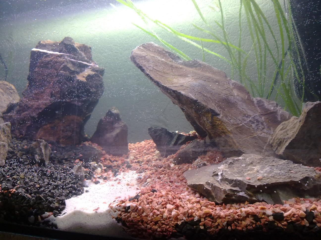 Затем выставил камни,примерно часа 1.5 это делал.Залил воду с цихлидника на 50% и 50% с крана(через душ для удаления хлора).Вода не мутнела и не белела.Баланс был установлен в течении дня.Ну а затем начал искать мхи.Нашел с трудом.На фото аквариуму 1,5 недели,мхи были привязаны аж на 7 день.Аквариум пока готов на 50%,еще валлиснерии много на заднем плане посажу по углам.Обматаю мхом правый наклонный камень.И поставлю в правом углу средних размеров остроконечный камень.И буду ждать))),когда все это преобразится.