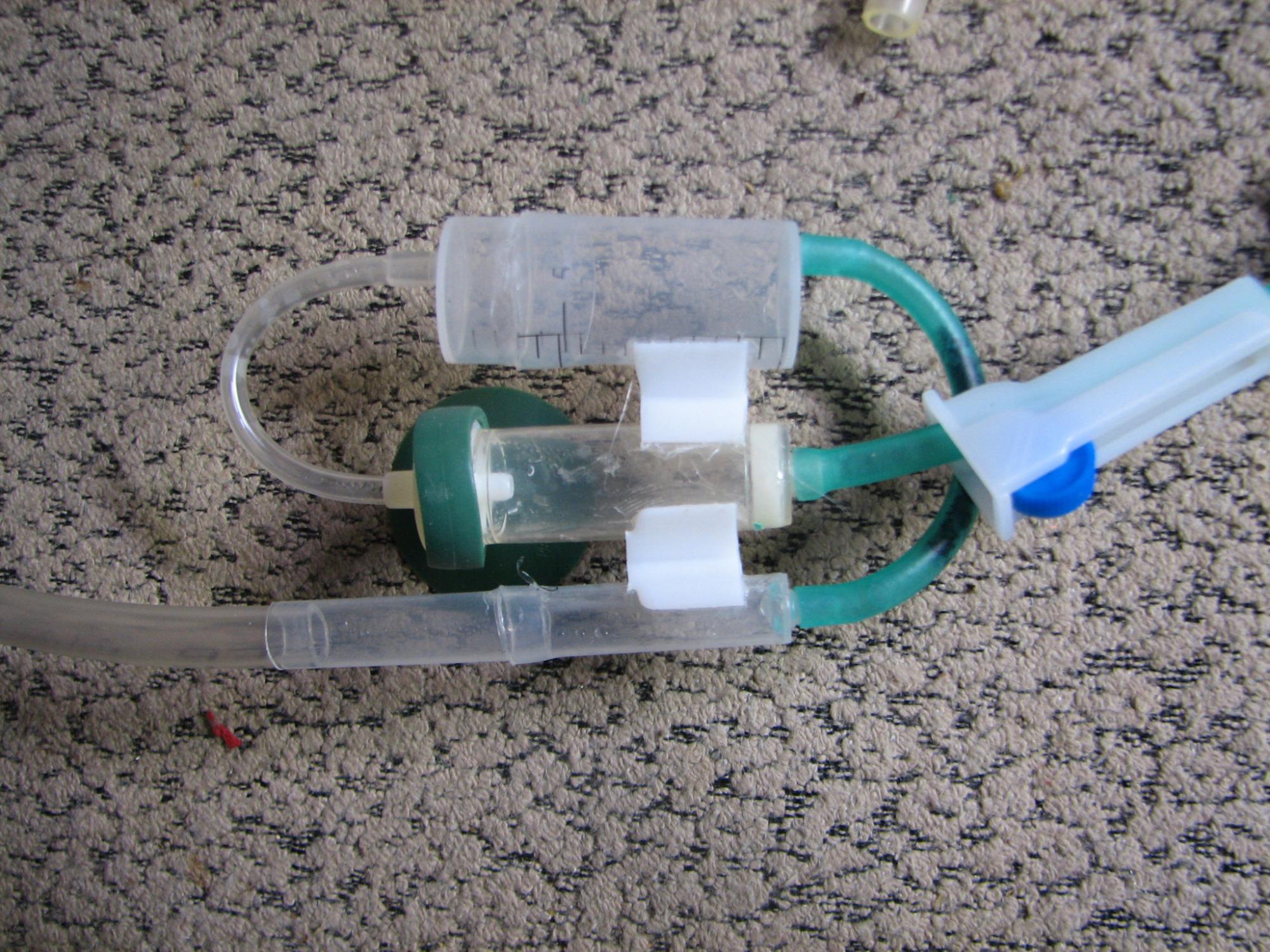 Состоит из бутылки, в пробку которой вставлены три трубки: для подачи воздуха с компрессора, медицинского катетера, для добавления с помощью шприца и капельницы, для регулировки подачи.