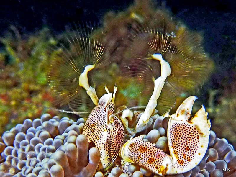 чуть-чуть дополню, Пык(AnCiStRuS) - вот этот крабик Neopetrolisthes ohshimai (еще называется фарфоровым, или анемоновым) является прекрасным симбионтом к мелким ковровым актиниям Stichodactyla tapetum, когда он селится на ней то практически постоянно находится на виду. Вреда остальным гидробионтом не наносит и наблюдать за ним - одно удовольствие...