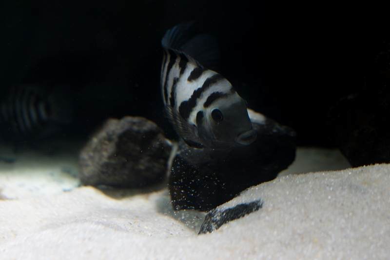 Чернополоскам явно понравился новый дизайн в аквариуме. Отметили смену декораций "по взрослому". Отметали икру на заднюю стенку, а сегодня уже вылупилась личинка. Её можно увидеть на песке, а на стенке всё ещё висят "скорлупки" от икры. Кстати, с малавийцами они уживаются без проблем. Если астронотусов, в своё время, чуть не выселили за пределы "ринга", то с этой бандой они вообще не конфликтуют. Просто отгоняют от потомства и всё. 90% аквы полностью в распоряжении малавийцев.