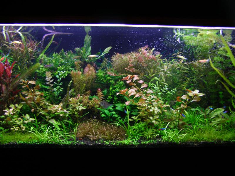 110л., Запущен начало 2010г., растения в начальной стадии роста, Sylvania Gro-Lux F15W, Sylvania Aquastar F15W, обогреватель-Aquael AQ 150, фильтр-Aquael FAN 2 Plus, освещение 10 часов, Неоны (Paracheirodon axelrodi) - 11шт, Попугаи (Pelvicachromis pulcher) - пара, Сомики крапчатые (Corydoras paleatus) - 3шт, Макропод (Macropodus opercularis) - пара, Меченосец (Poeciliidae) - пара, подмена воды раз в два дня 10л.