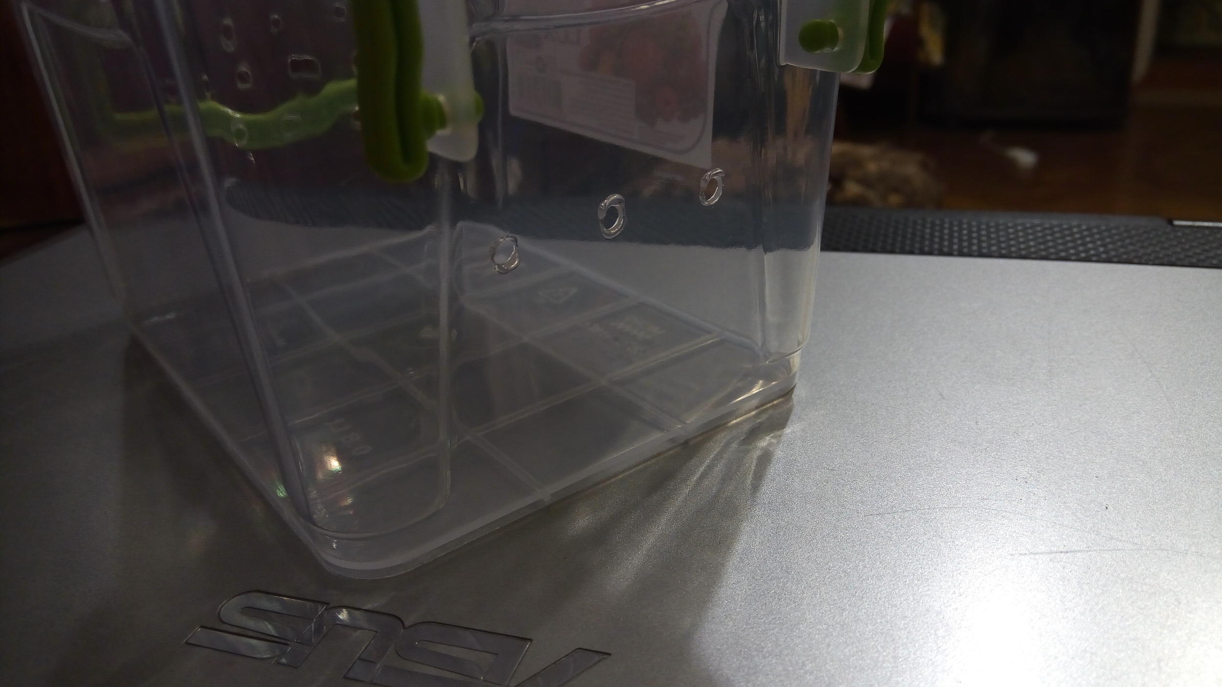 Итак, господа, решил перестраховаться и показать будущую салатницу для перелинявшего Маршали L5. Емкость 0.8 л. Интересует планировка вентиляции. В салатнице будет примерно 2 см кокоса и пластиковая крышка в качестве поилочки.