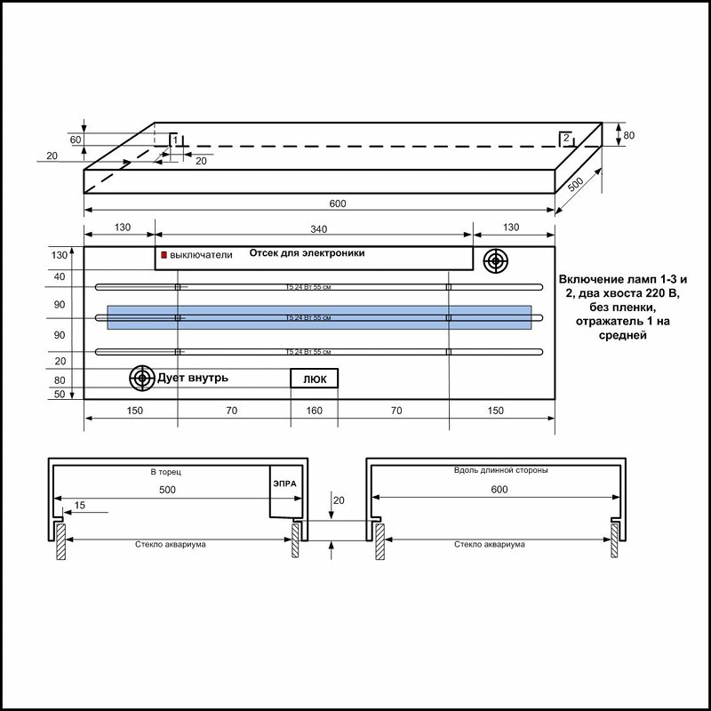 установлена электроника на 3 лампы Т5 типа по 24 Вт каждая;