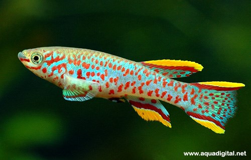 Размер взрослой рыбы - 2,5 - 3 см. Рыбка очень подвижная, любознательная и всё время находится - на виду. Самки имеют - жёлто-оранжевый цвет, а самцы - фиолетово-голубые с неоновым отливом. Поведением и внешним видом напоминают - мелких радужниц. Неприхотливы и питаются любыми сухими и мороженными кормами - соответствующего размера. Рыбки абсолютно неагрессивны по отношению к своим сородичам и другим жителям аквариума, включая - креветок.