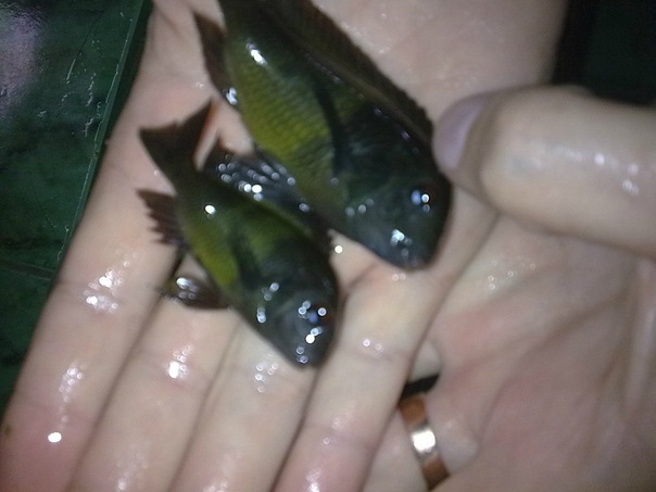 Как видите, человек ни разу не упоминает о качестве рыбы, его больше заботят другие вещи. Я обещал ему ответить на все его вопросы и кажется подробно это сделал. В завершении хочу сказать, что цель этого опуса не сказать, что вся рыба продаваемая вышеназваным продавцом плохая, отнюдь, как то брал у него мальков эретмодусов, претензий нет. Но в данной, конкретной сделке он повёл себя как АФЕРИСТ и НЕГОДЯЙ!!! О чём я и предупреждаю одноклубников и просто любителей Танги. Более красноречиво прокоментируют ситуацию, сделанные фото "супер трофов". На двух, на ладони для сравнения, лежат две рыбки одного возраста (мы не поленились и поймали мою самку), как говорится ощутите разницу.
