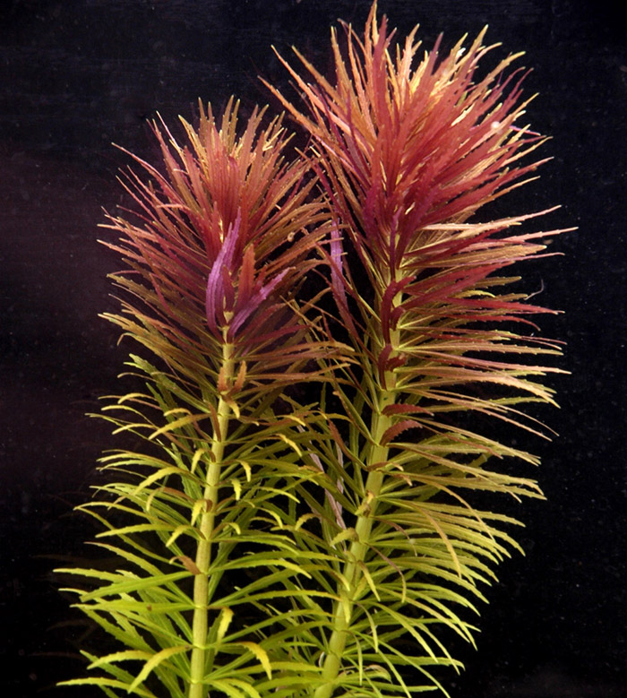 Перистолистник красностебельный (Myriophyllum heterophyllum). Симпатичный гость с Флориды, с красным, растущим очень длинным стеблем и зелёными листьями. Становится особенно красивым, если позволить подросшей веточке лечь на поверхность и в ток воды.