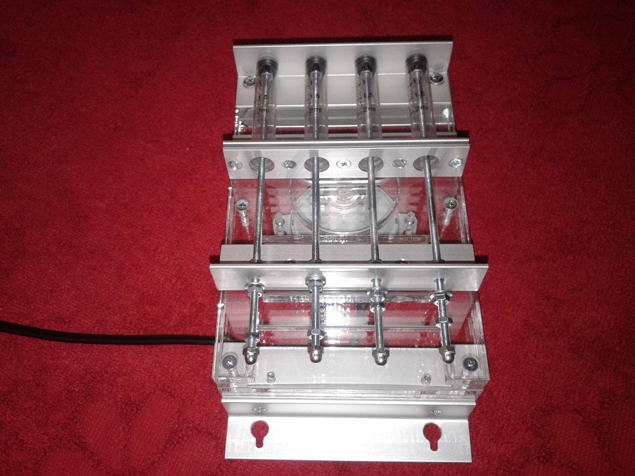 Подавать удо желательно за две и более минут работы дозатора.Это позволит,при желании,уменьшить подачу удо в аквариум сократив время подачи на таймере.Один раз настроили дозатор и больше не крутим регулировочные гайки.Например,выставили на три минуты-это максимальная подача,произвели подрезку растений,сократили время подачи и т.д.Т.е.регулируем подачу временем.Советую настраивать один шприц на подачу 5мл удо в минуту.Если необходимо внести меньшую дозу удо в аквариум,то разбавляем удо с дист.водой в соответсвующей пропорции.