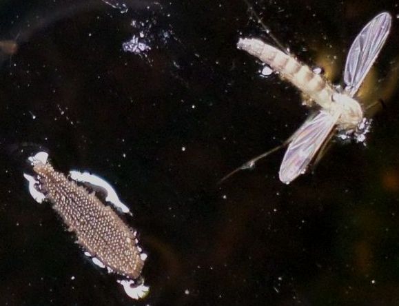 Летом баловал личинками комара пискуна (который кусает), по простому чертик. Гупаки его обожают, причем в аквариуме плавают мальки меньшие размером, их не трогают, а за этими гоняются. Не зря их от малярийного комара везде заселяют. Летом на улице в любой емкости сами немеряно разводятся эти чертики, и риск заразить меньше, если ловить не в рыбных водоемах. Чтобы быстрее росли личинки кидаю в емкость связаный пучек травы, чтобы можно было вынуть перед выловом. И почаще отлавливать, пока не окуклились. Сфоткал комара, отложившего яйца