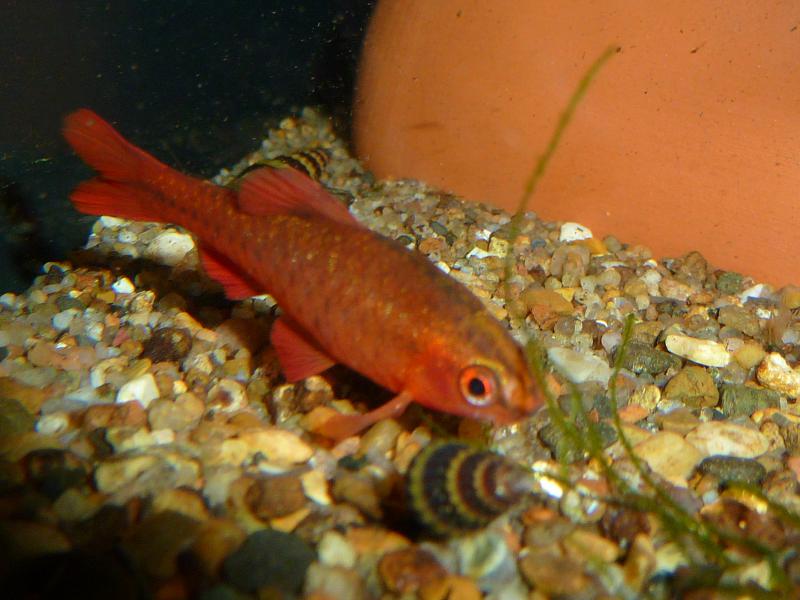 У меня живут трое вишневых, вопреки ожиданиям очень спокойные не пугливые рыбки(правда сперва всего боялись  , но привыкли) - все время на виду, даже у переднего стекла плавают. Сейчас растет молодняк - первый выводок  Есть еще 5 барбусов Шуберта - тоже красавцы, шустрые, активные но ещё немного боязливые.