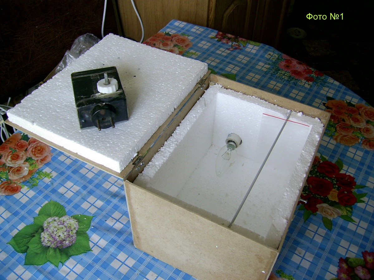 Фото№5. Регулируется напряжение лампы детским регулятором напряжения. От него же подается напряжение на вентилятор. Изготовлен он в 70-xx годах прошлого столетия. Сейчас такой трудно найти. Но можно взять блок питания от старого маломощного компьютера и будет вам успех гарантирован. Температура держится стабильно, перемешивание воздуха обеспечивает постояннство температуры на всем протяжении, энергозатраты - 3-4 кВт*ч в месяц.
