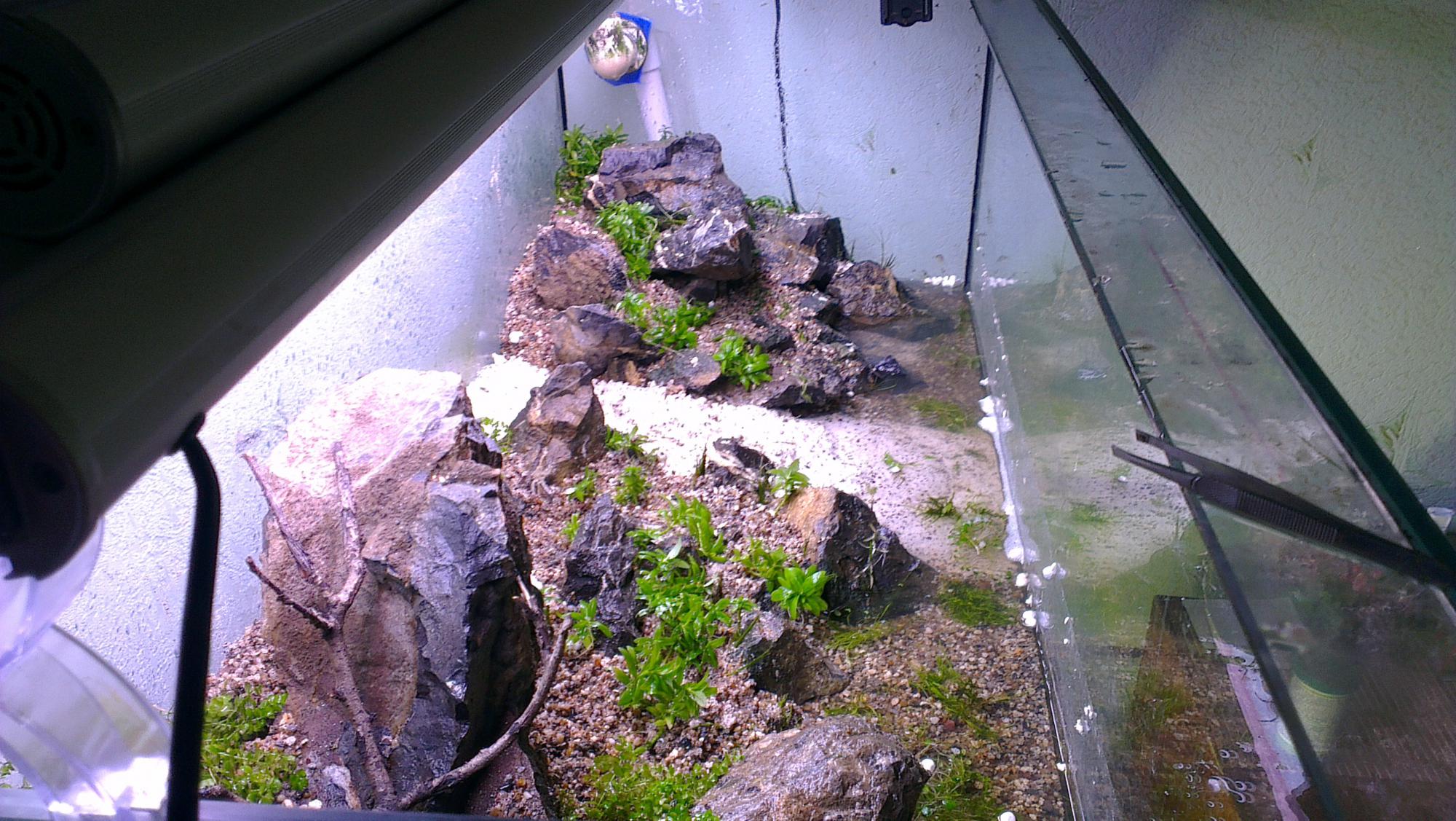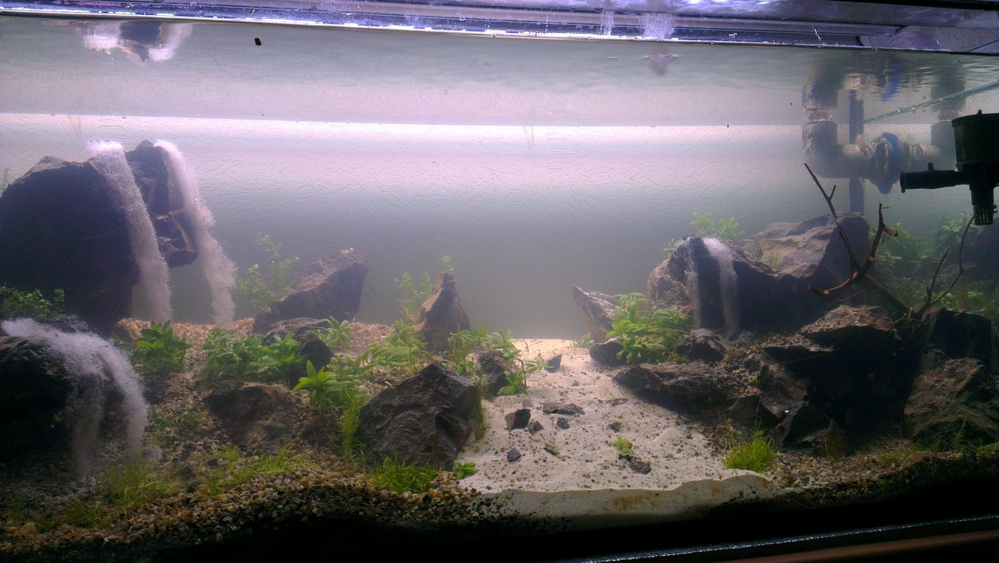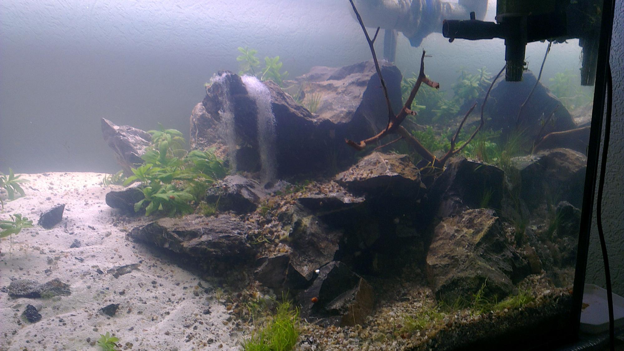 Вот и запустил аквариум.Готовность 80%.Теперь объясню как все должно быть.Для примера я на скорую руку прицепил синтепон,чтоб Вы увидели как примерно будут выглядить водопады.Они не все конечно похожы на водопады,но это все на скорую руку.На заднем плане за главным камнем и за 2 "горами" справа от него посадил микрантенум(когда вырастит,то будет напоминать кроны деревьев за горами.В центре посадил стаурогин он будет напоминать тоже деревья,но намного меньше(как бы с высоты водопада на них смотреть.Передний план-утрикулярия.Справа в углу посадил хедуотис(тоже симмитировать деревья).Ну а в остальных местах посадил ситняг парвула,глоссостигму,стаурогин.В левом углу над каскадами водопадов поставил ветку и обматал мхом(со временем должно получиться дерево).Также и справа тоже будет дерево.Но времени не хватило обматать мхом.В ценрте за стаурогином поставлю веточки и обматаю мхами,чтоб получились деревья.Вообщем пока так.