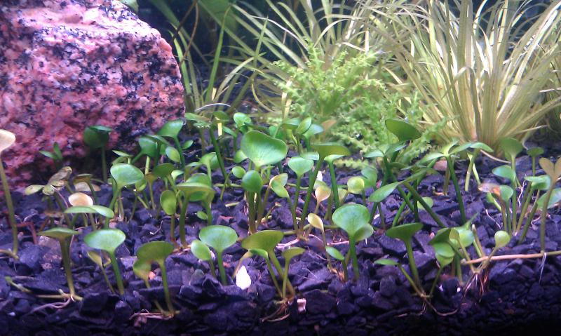 кабомба (или кто она там) выросла сантиметров 15, людвигия - около 5, у перестолистника появились новые ростки. криптокорины вроде неплохо. вот бликса похуже приживается, листики стали желто-зеленые, а некоторые даже потемнели. досадил немного. кстати, что это за растение с маленькими листиками на переднем плане?
