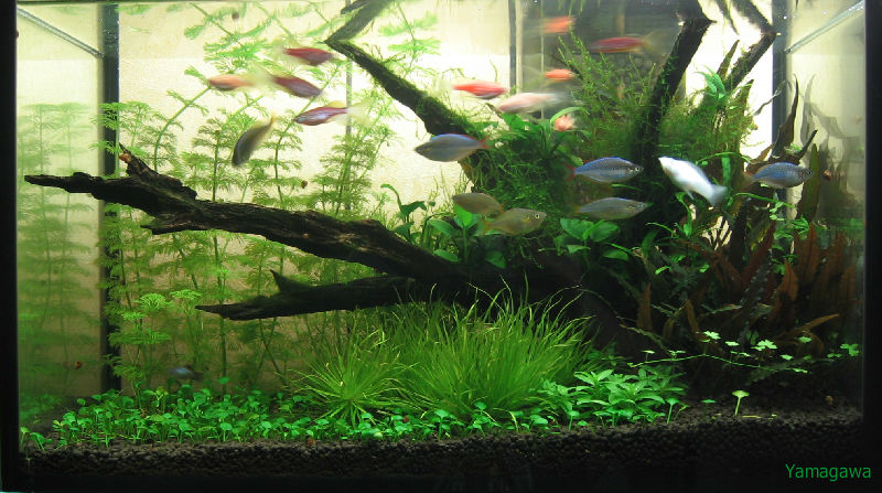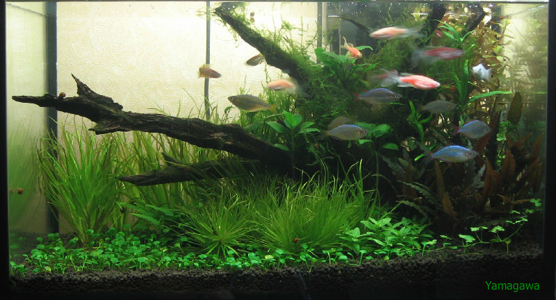 Yamagawa, молодец, что начал экспериментировать! Всё придёт с опытом - и какая толщина грунта под какое растение и рыбы какие под такой аквасик (растения, рыбы, свободное пространство всё должно быть пропорционально размеру аквасика! Лимнофилка простовата для этой композиции. Здесь ещё много работы, нужно продумать сочетания листьев растений. Бликсы красивые! Анубы и крипты мне кажется лишними, но это только моё мнение. На задний план, за корягу я бы посадила ситняг игольчатый. На коряжках можно мелкие детали проработать: покрыть их небольшими островками мха и чего то кругленького повторяя форму глоссы, но чуть крупнее (показать второй план). Наполняй картинку мелкими деталями, но чтоб они не разрушали целостность восприятия! Удачи и сладких мук творчества  !