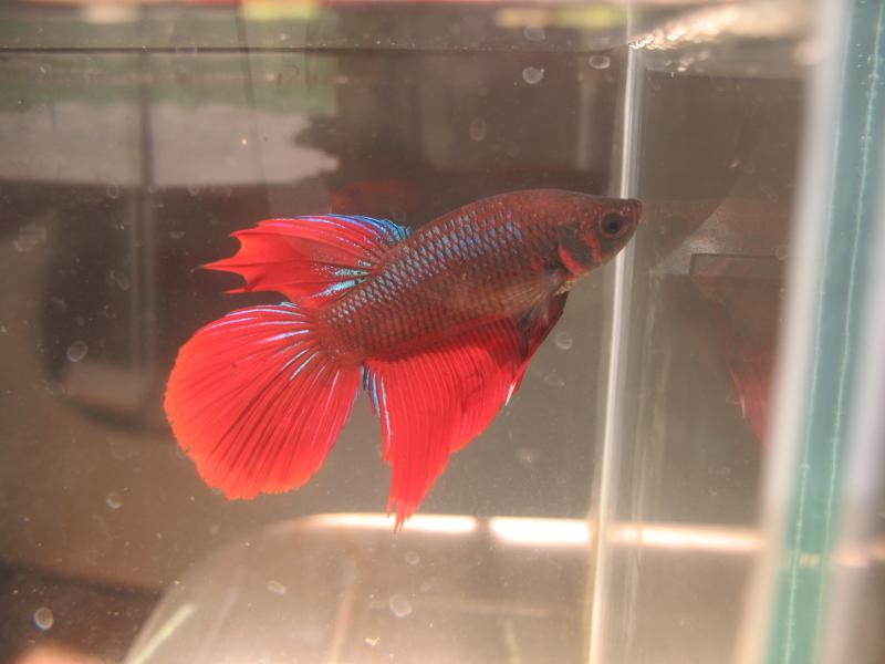Остались сине-красного окраса и один красный,который на этой фотке,только теперь он взрослей и хвост с плавниками у него в 2 раза больше