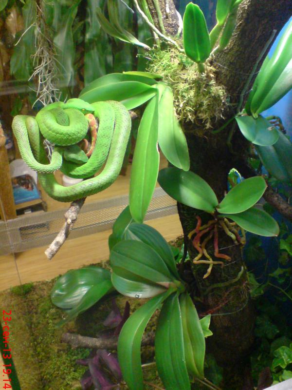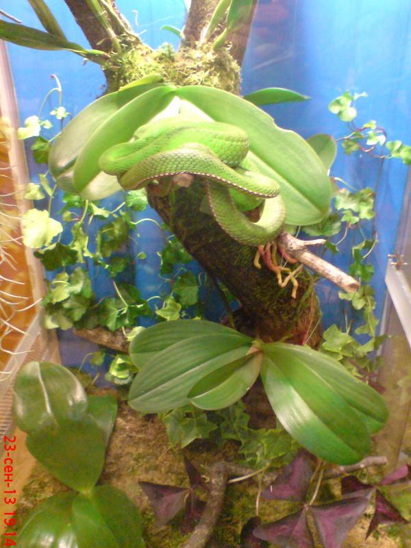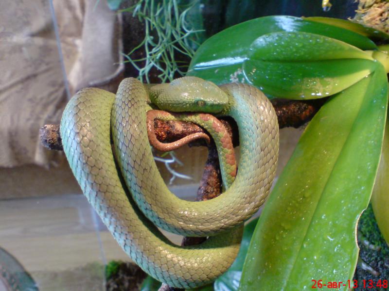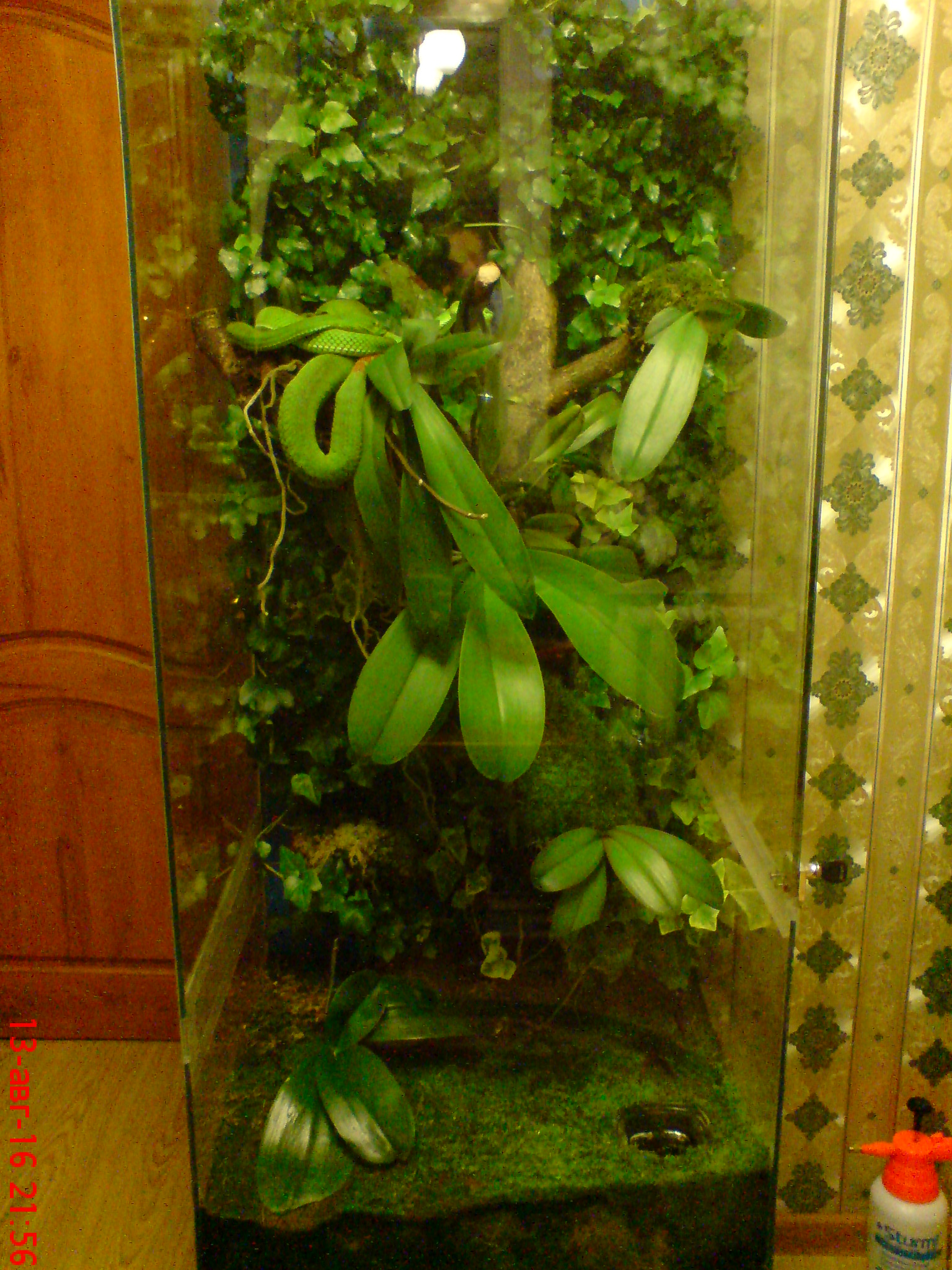 влажность поддерживается за счет опрыскивания дистиллированной водой дважды в день в 12 и 21 час. в 12 часов опрыскиваю и змей вечером только террариум. влажность находится на уровне 75-90%.