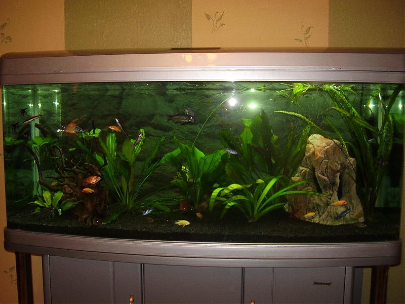 Никогда не держал цихлид, хотя некоторые из них мне всегда нравились. И вот после запуска нового аквариума, решил держать цихлид. Своих неонов, стекляных сомов и т. д. продал, а оставил только крупных малабарских данио, боции клоун, анцитрусов, барбусов, попугаев. Попугаи и скаляриии я держал всегда, потому что то цихлиды, но они никогда не едят растения. Раньше не держал других цихлид, потому что хотел иметь растения и цихлиды, но мне говорили аквариумисты что это невозможно. И вот в свой новый аквариум я запустил 7 видов цихлид озера Малави: йодотрофеус, пседотрофеус голд, ломбардо, орнатус и еще 3 вида, которые я не запомнил( вроде бы йохани, йохани ред и еще что-то) на фото видно. Мой знакомый, который мне их привозил, убедил меня, что жестколистные растения они не едят. Я его просил привезти именно такие, что не едят живые растения и красивых внешне, т.е. мне нравятся цихлиды яркой окраски и без выпуклых нижней челюсти. Те, которые он мне привез, мне нравятся. Только не уверен, что они не едет растения, так как прочитал я в литературе, что все малавийские цихлиды любители растений. У меня в аквариуме есть эхинодорусы, анубиасы, сагитария, апоногетон.