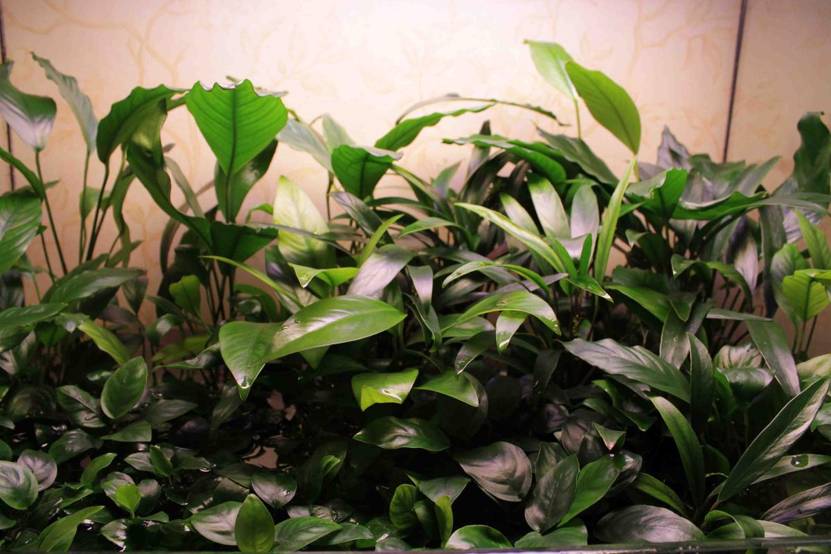 Анубиасы растут в трёх емкостях (аквариумы, 2 по 96л, 1 на 80л), правда, одна ёмкость на 96 литров временно превратилась в полуаквариум-полупалюдариум в связи с появившимся выводком попугайчиков.