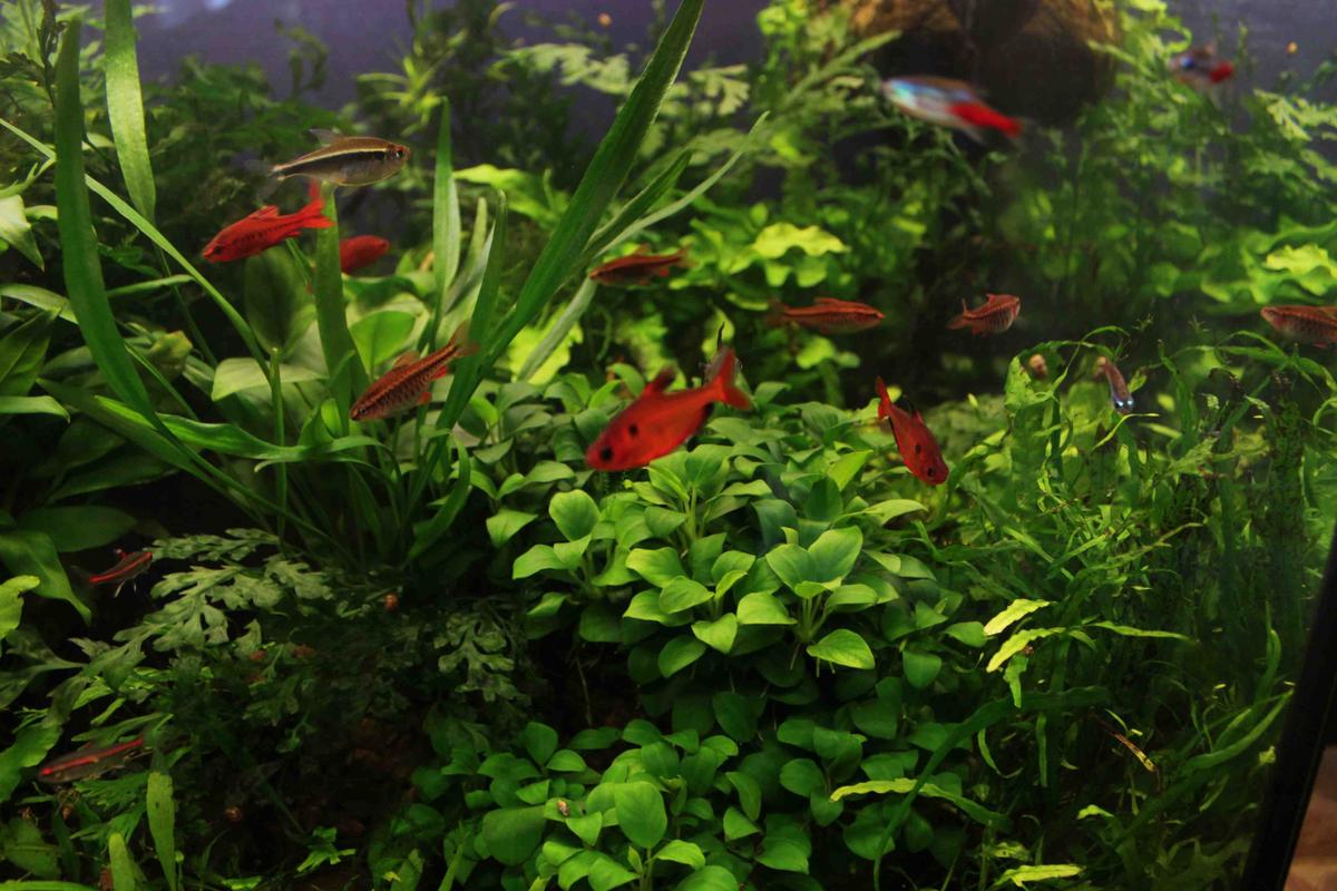 Из населения, в основном, живородка. Есть также немного харацинки и попугайчики. Кормлю заморозкой, сухарём, тыквой, творогом, нури, в общем, всем подряд, кроме сала и горилки
