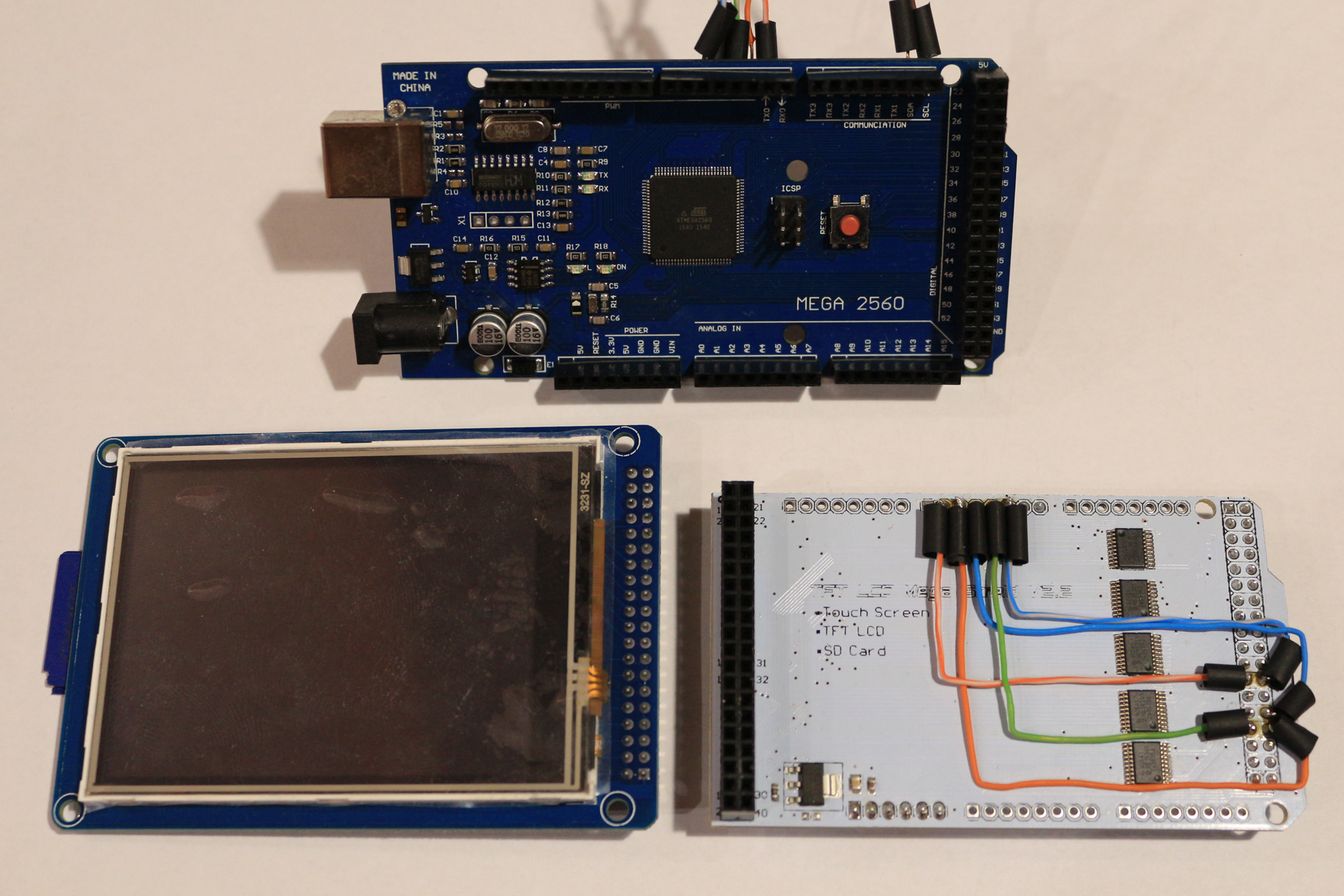 Для получения приятной картинки необходима возможность поиграться со спектрами. Для управлениями этими спектрами - нужен контроллер. Решение - поиграться с конструктором Arduino, и с популярными на его базе сборками. В частности, на базе платы Arduino Mega + шилд (переходник) под экран и сам TFT экран (3.2 дюйма, 320Х240).