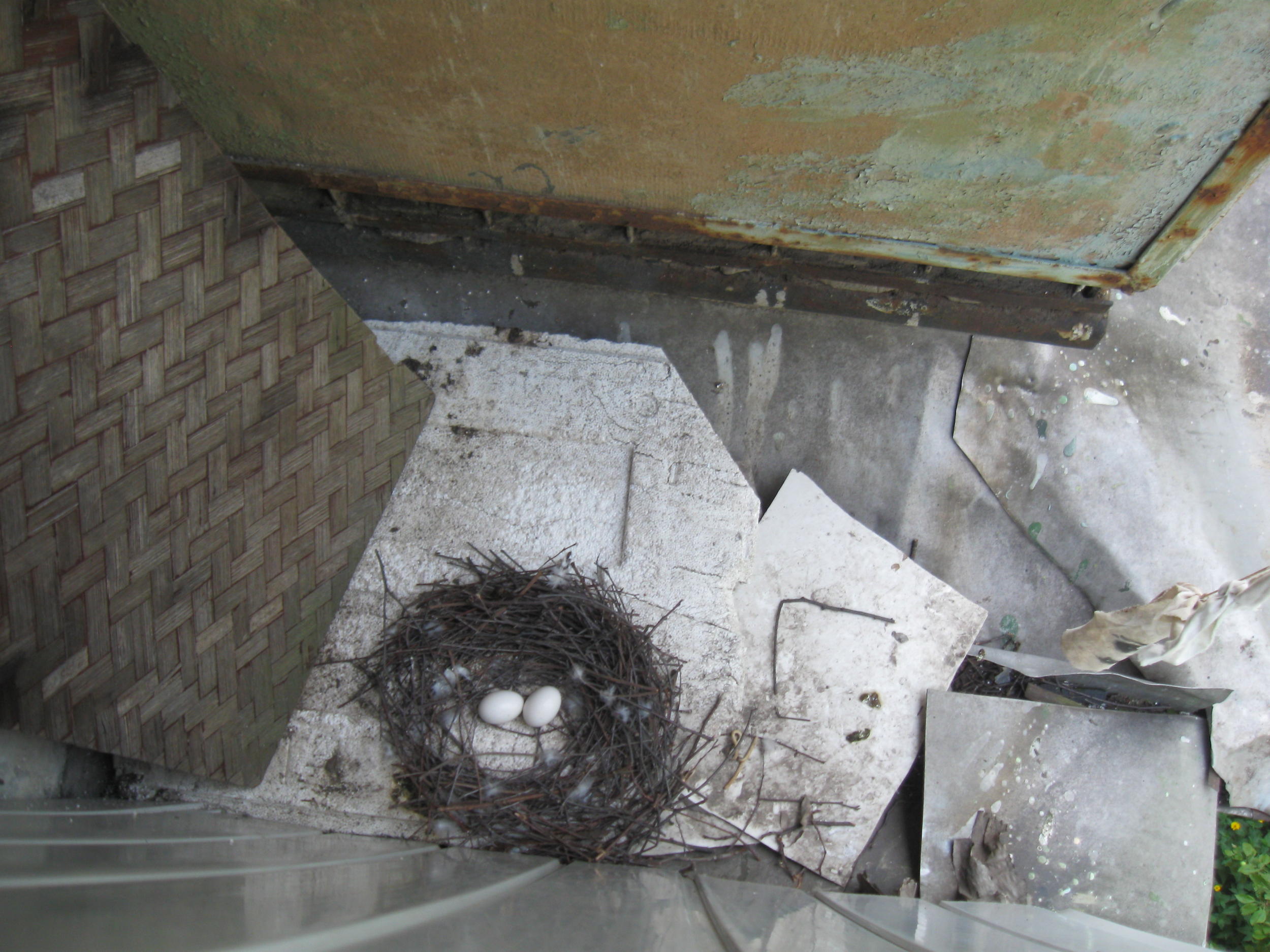 Сегодня немного убирал на балконе.Выглянул в пространство между моим балконом и соседей.А там голубка вспорхнула с яиц.Вот так ,между двумя балконами на карнизах птицы выстлали материю,сваяли гнездо из веточек и дают потомству жизнь.Значит и для птиц Харьков удобен и привлекателен!