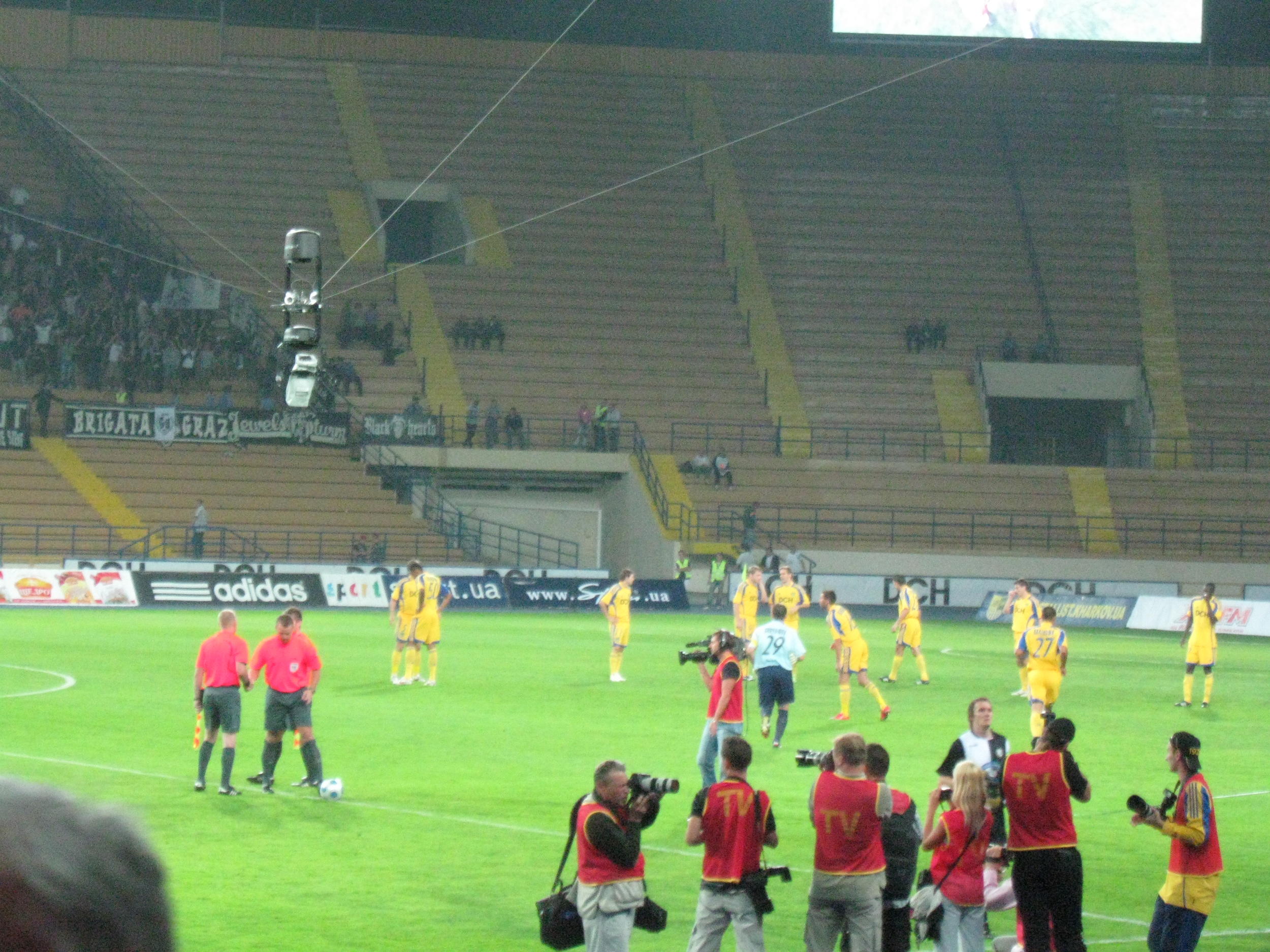 а вот и фото стадиона Металлист перед одной из игр нашего чемпионата.Хорошо видно устройство с телекамерой,которое перемещается над полем и все снимает сверху.Всевидящий глаз..Такой себе "паук".Стоил кажется миллион $.А билет на стадион,то место,с которого я снял это ,стоил 120 грн.Далеко не самый дорогой,но и не самый дешевый...