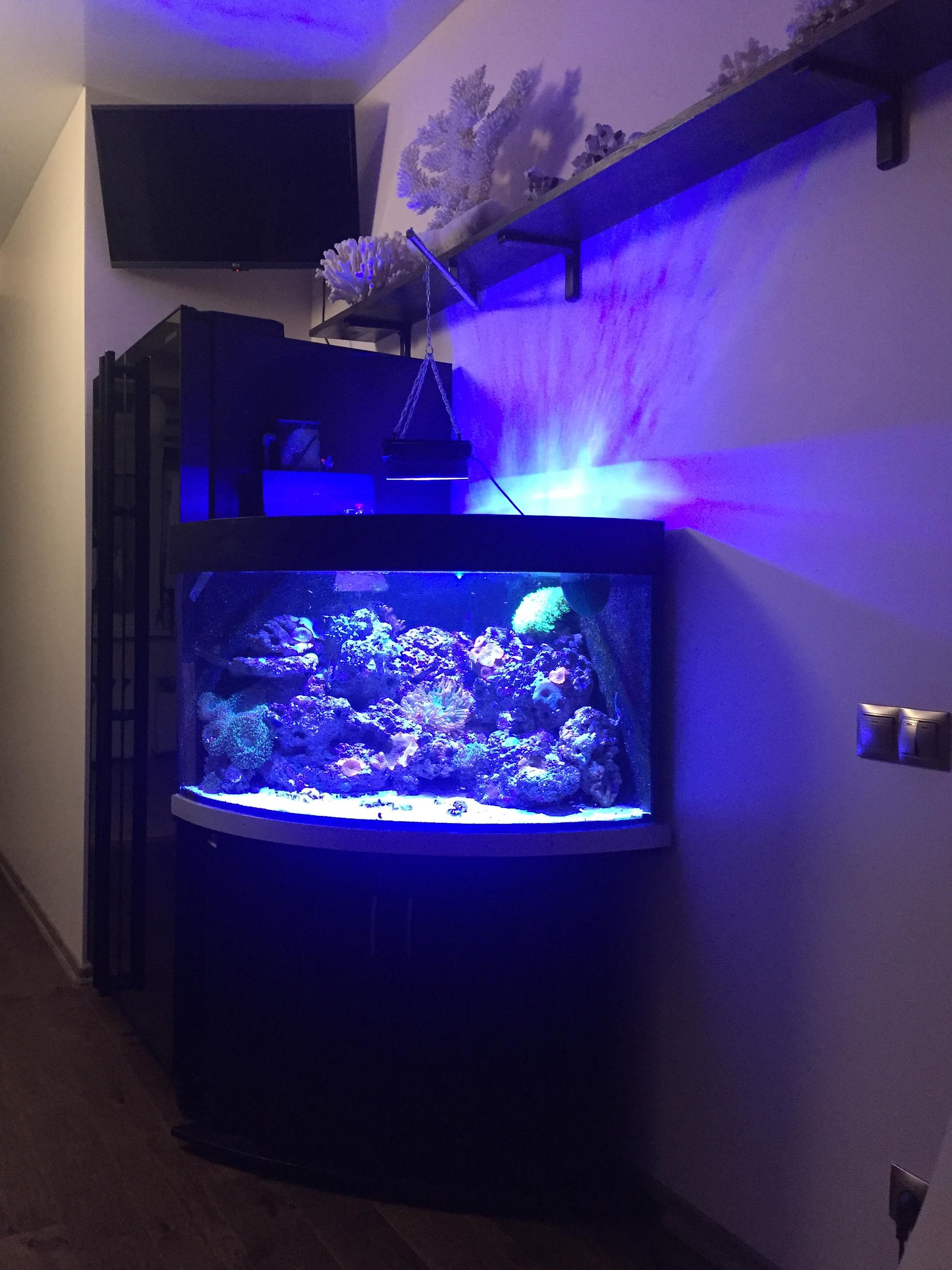Хочу рассказать о своём угловом аквариуме. Изначально в нем жили цихлиды. О море мечтал давно, но пугала сложность запуска и сложность ухода в последующем. По крайней мере это всё казалось сложным потому, что в сети описываются в основном аквариумы для жестких кораллов. По работе часто и очень надолго уезжаю в командировки(несколько месяцев) и поэтому нужно было сделать морской аквариум с которым мог бы справиться даже человек не имеющий никакого опыта в аквариумистике, а тем более морской (моя жена). Требующий минимум ухода, что бы её не напрягать сильно.