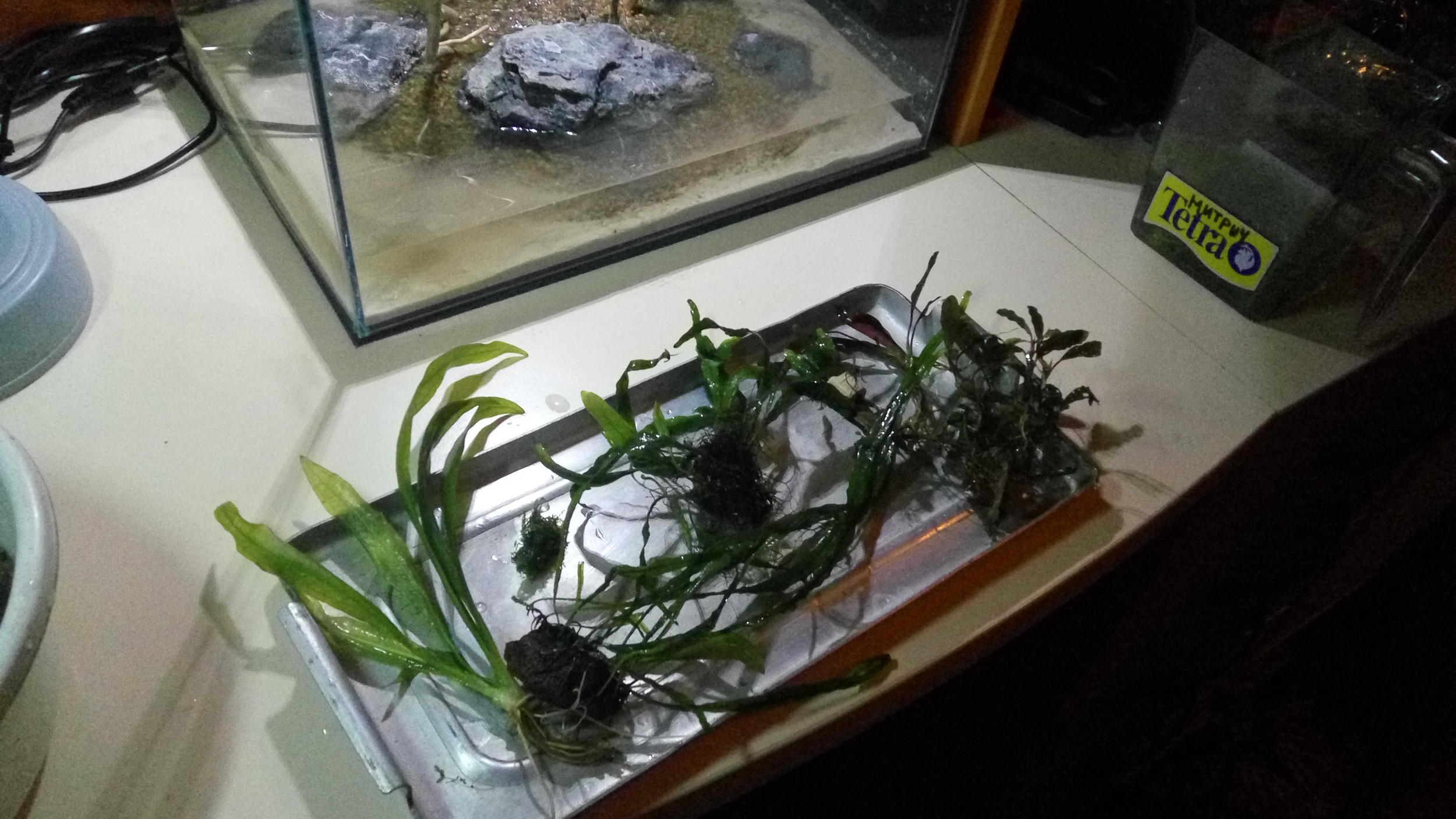 Мы с папой налили чуть-чуть воды. И я занялась посадкой растений. Использывала такие как: Буцифаландра, папоротники, Анубиас, Эхинадорус, Стаурагин.