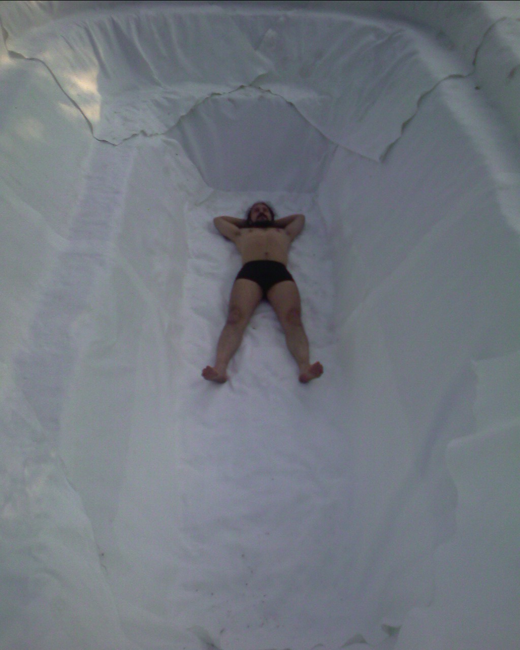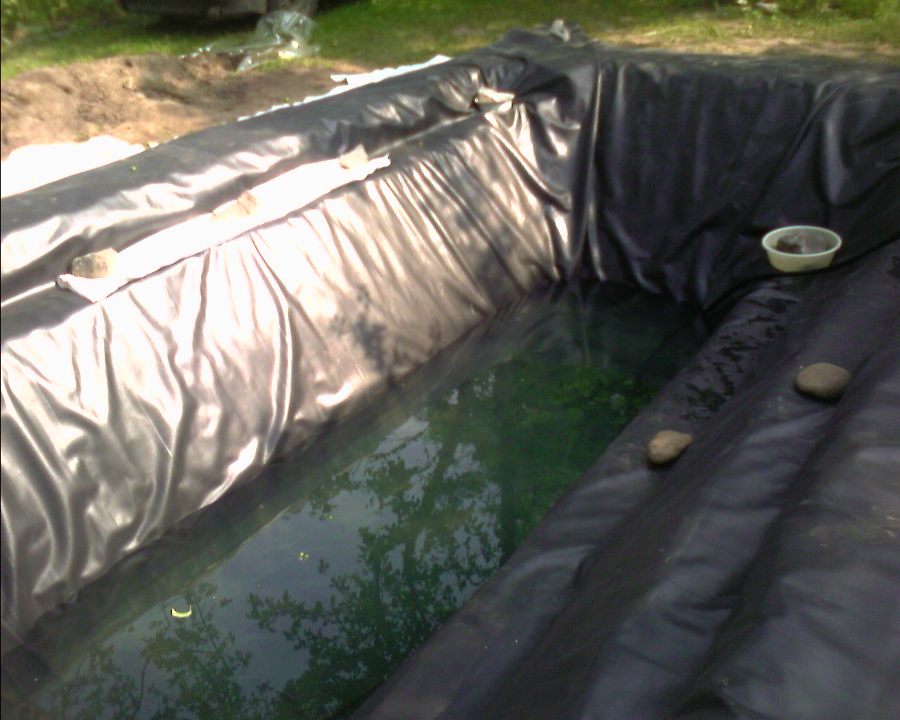 Пришло время пленки. Я выбрал пленку EPDM (этилен пропилен диен мономер). Если выучить название, то можно щеголять своими «знаниями» органической химии. Это самая дорогая пленка. Почему же я выбрал дорогую? Тем более когда бюджет весьма ограничен. Основа чего либо должна быть самая долговечная и надежная! Когда вы ремонтируете двигатель можно поставить дешевые польские поршни. Мало того, они будут прекрасно работать. Но вот вопрос, как долго? И возможно, что в критической ситуации они Вас подведут. Не сомневайтесь! Пленка это основа пруда. Залог его безпроблемности и долголетия. К тому же самая прочная. Мы ведь собрались купаться и ходить по дну! Ладно, хватит лирики. Хочу обратить Ваше внимание на то, что пленка толщиной один миллиметр и размерами 6х9 метров весит более 80 килограмм. Лучше такой кусок стелить втроем или вчетвером. Укладываем пленку. Выбираем все мелкие складки в несколько крупных. Работа не самая трудная, но кропотливая. Все делаем не спеша и с улыбкой. Фиксируем пленку на террасах гладкими камнями или пластиковой посудой (с камнями не гладкими). Проверяем работу, ходим вокруг пруда и фотографируемся.