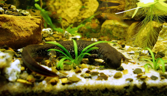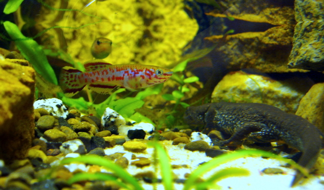 Ужин. Тритон был не в настроении позировать, когда под ногами (пардон, лапами) столько вкусного мотыля...Надо успеть собрать, пока это не сделали килли и креветки