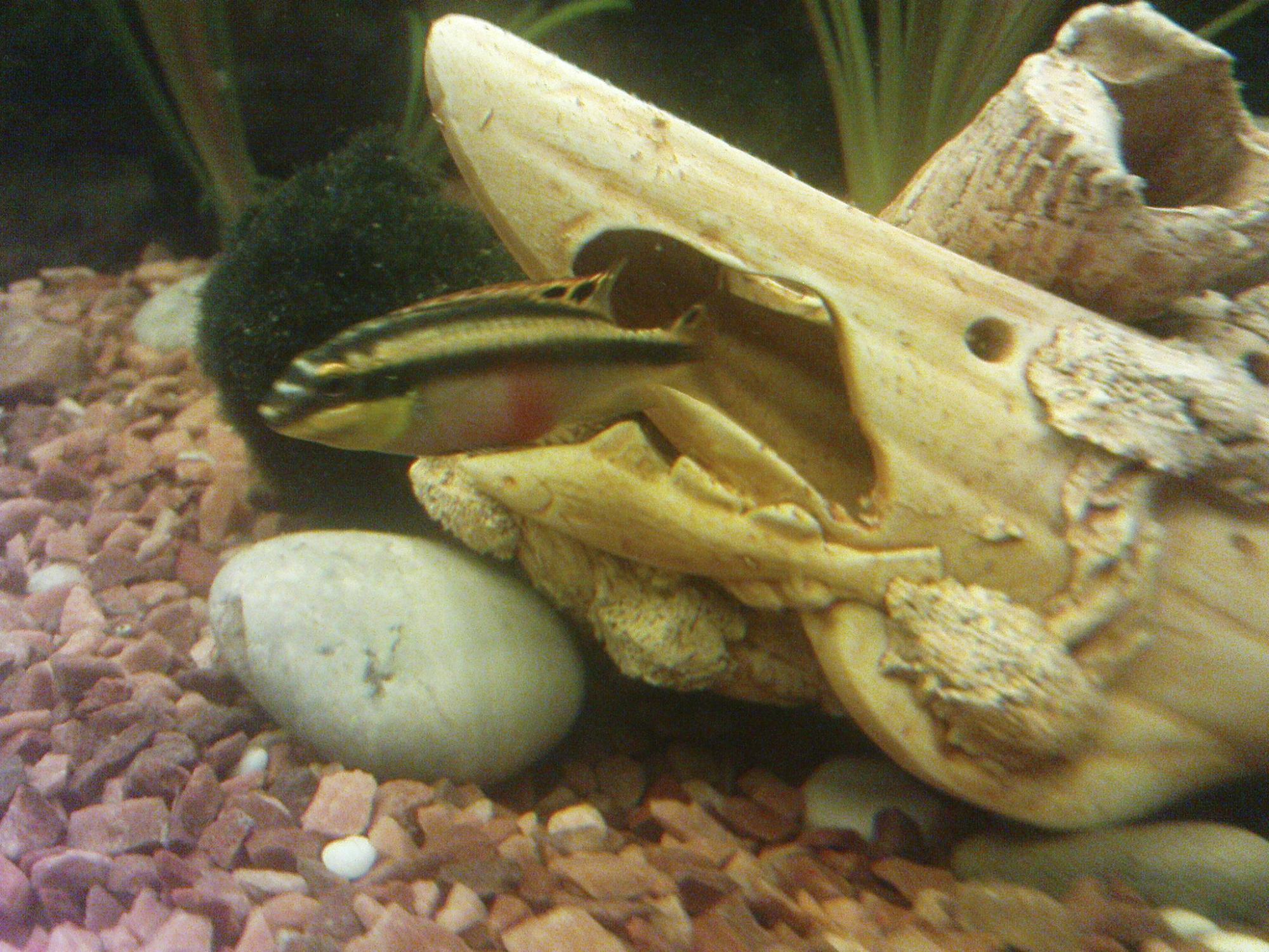 Pelvicachromis pulcher у меня самые большие из всех (средний размер цихлид 4-5 см), самец около 8 см, самка 6, они себе окупировали небольшой кораблик и сделали под ним подкоп, самка то в кораблике, то под корабликом, похудела сейчас, на кормление выходит, но очень быстро обратно возвращается... думаю, уже через пару дней мальи должны поплыть (я в их гнездо не лезу, поэтому не знаю, на какой стадии личинки)