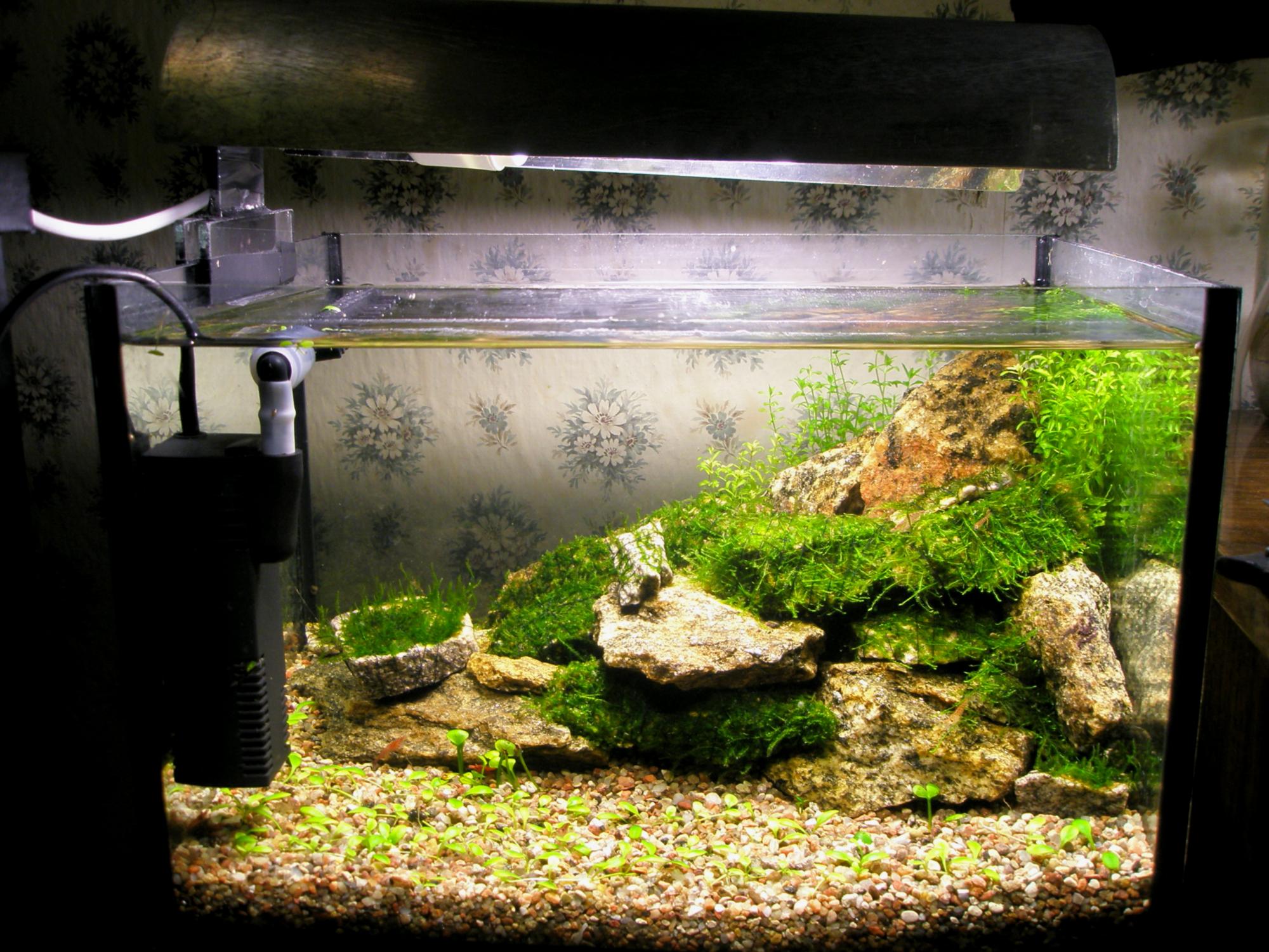 Вобщем начну с того что у меня появился не один вид мхов. Мне давно хотелось сделать баночку под мхи, но так как у меня кроме яванского мха больше никаких небыло вот и повода особого небыло. Благодаря добрым людям, которые поделились со мной фиседенсом и мох пламя  а также мхом крисмас  ( огромноекто человеческое спасибо прочитают поймут) у меня появился повод сделать баночку. Я пошел в подвал и с старой оконой рамы нарезал стекла и склеил баночку Д30 Ш20 В20. На следующий день поехал за камнями и грунтом. Вечером на дно насыпал тетровского питательного грунта а сверху гравий с нашего моря фракцией 3-5мм. И тут началось самое трудное! С 18-00 и до 00-00 я мостил и мотал мхами камни, много раз пришлось переставлять перематывать и всякое такое, пока начало походить на то что мне хотелось увидеть. Ограниченость в камнях и малом объеме, создало много трудностей с которыми пришлось боротся. В моем минике живут:Christmas Moss,Flame Moss,Phoenix Moss,Java Moss, Micranthemum micranthemoides,Glossostigma elatinoides также креветки чери, любезно предоставленные Mastacembelus дружыще огромное тебе спасибо! Еще хочу добавить в композицию химеантус куба но пока у меня его нет  Вот собственно и мое детище запущенное 29.05.09 сами понемаете пока вида никакого да ковсему у меня идет в квартире ремонт и аквариум стоит возле большого аквариума на табуретке, а через аквариум просматривается забавный фон в цветочек  , Фон пока нет и небудет пока банка не созреет а тогда буду подберать и фон. Вот собственно и он мой миник. Жду коментариев и критики. По мере изминений и созревания аквариума буду добавлять фото. http://aquaforum.kiev.ua/attachment....1&d=1243902937