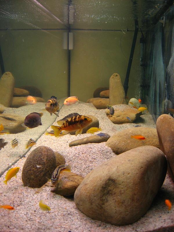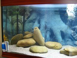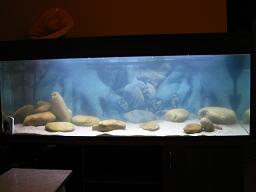 После того как сбылась мечта моя (и рыбасов ютившихся в 130литрах), тобишь когда была приобретена банка размерами 1500х50х45 (фотоь 2) началась головоломка как ее оформить. Цель была воссоздать нечто максимально приближенное к скалистому биотопу озера Малави. Спасибо за тему "Фрагменты оз. Малави" ее создателю а так же интернету за его неисчерпаемые ресурсы. Изначально была идея купить обьемный фон (фирмы Аквафон), но по причине достаточной дороговизны сиего счастьтя (учитывая что длинна аквы 150мм+ было желание отделать так же боковые стенки) от этой идеи пришлось отказаться(возможно что временно). Была идея смастерить нечто подобное из пенопласт-цемент-краска, но эта идея тоже так и не нашла своего воплошения. В итоге было решено оставить родной фон (переклеить на вазелин) и начинать запуск. (Так как аква уже почти неделю стояла с водой и уже 3 дня как работал внешник) да и просто очень уже хотелось если честно  .