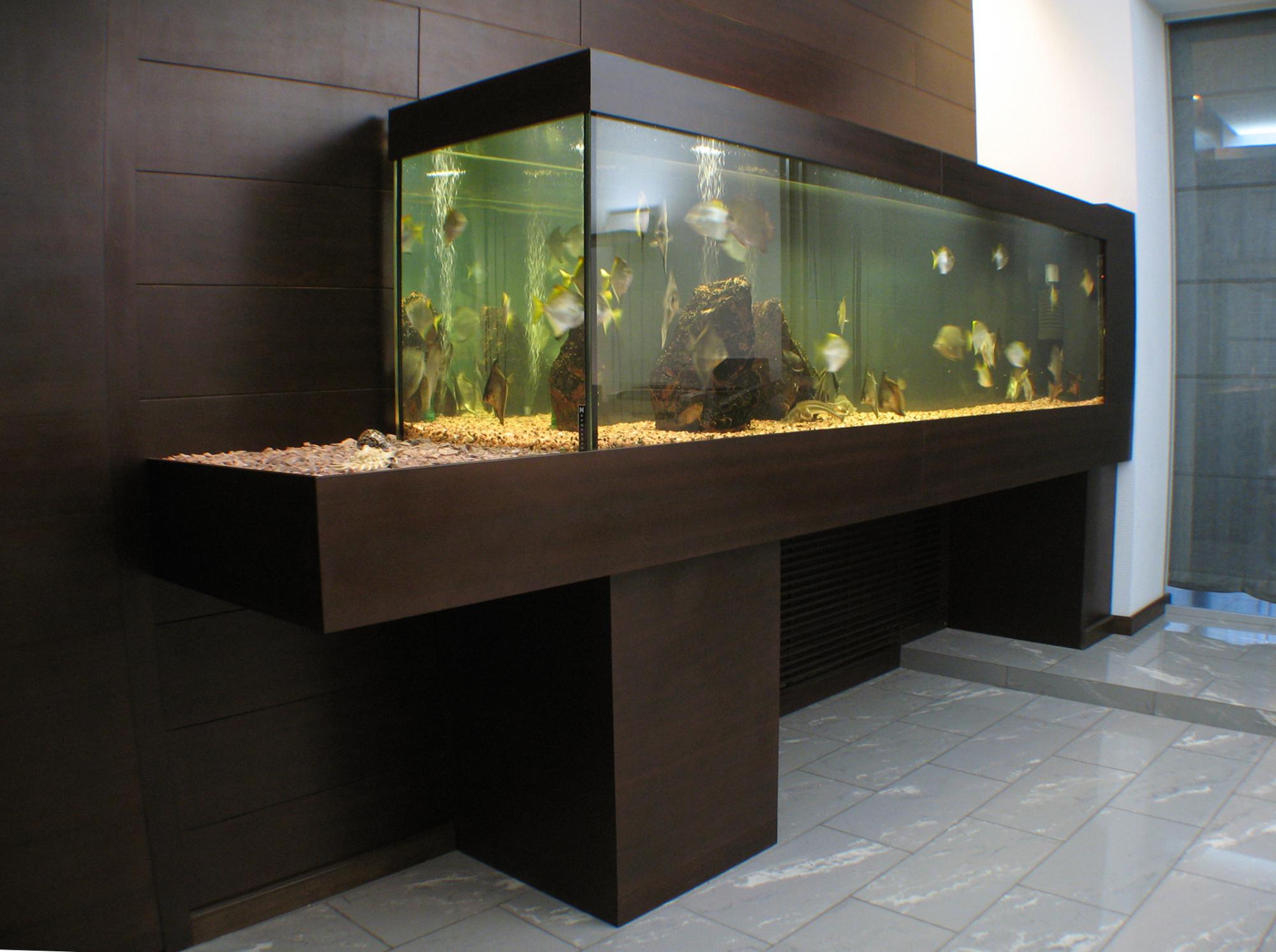 Можно аквариум ставить и на металлоконструкцию, а затем навешивать любые фасады. Вариантов используемых материалов очень много: МДФ, стекло, ДСП...