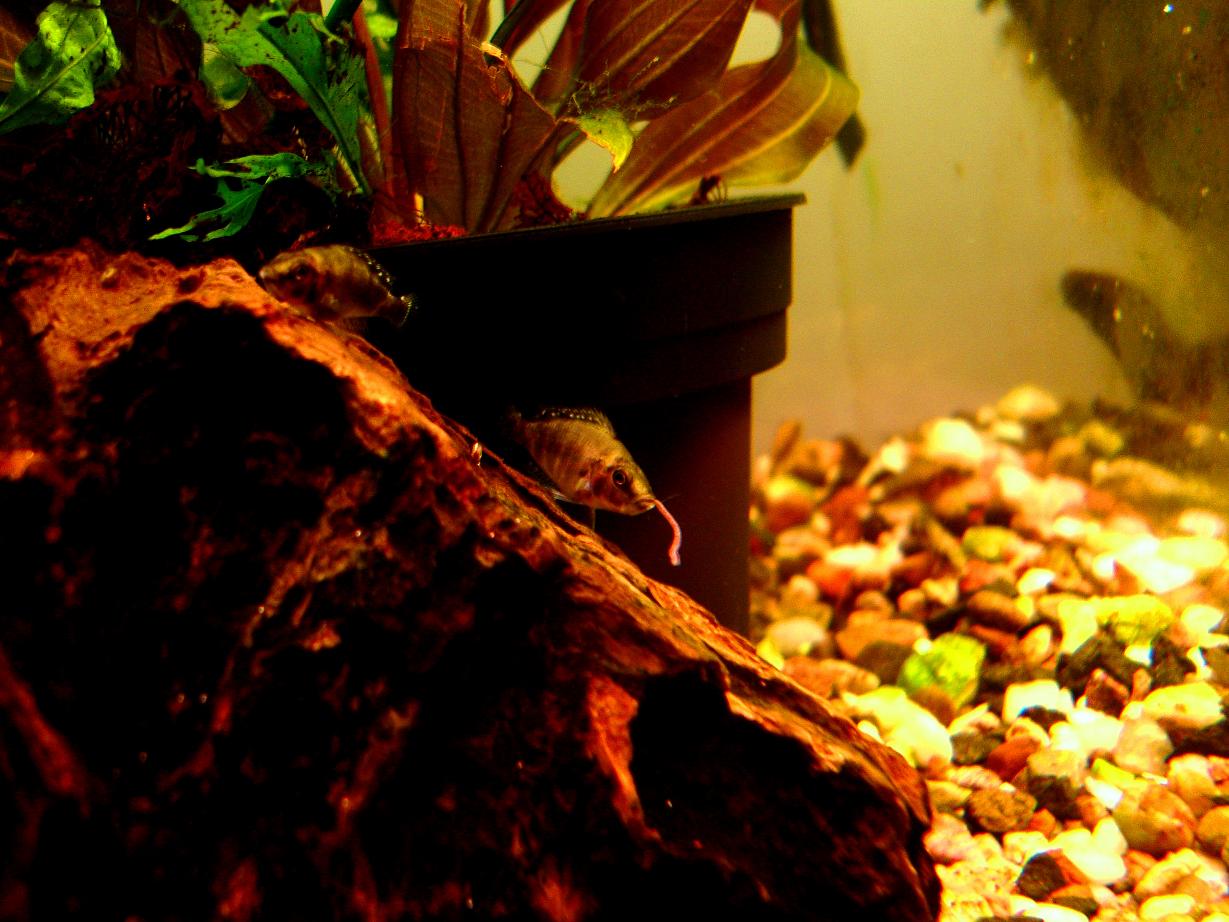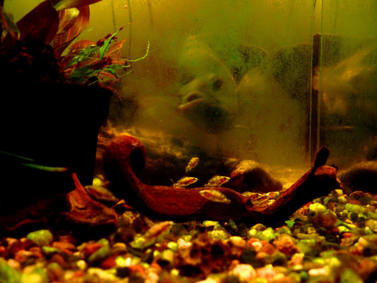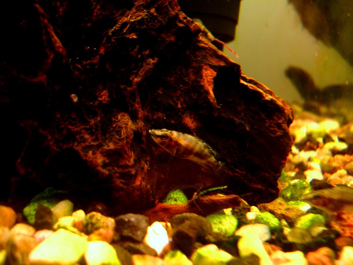 Робив фото, з піднятою кришкою, риба поховалась. Малька аltolamprologusа пересадив в акваріум з астронотусом(привидение) і розділив перегородкою з акрила.
