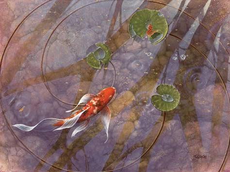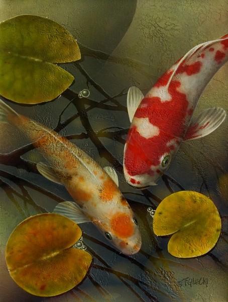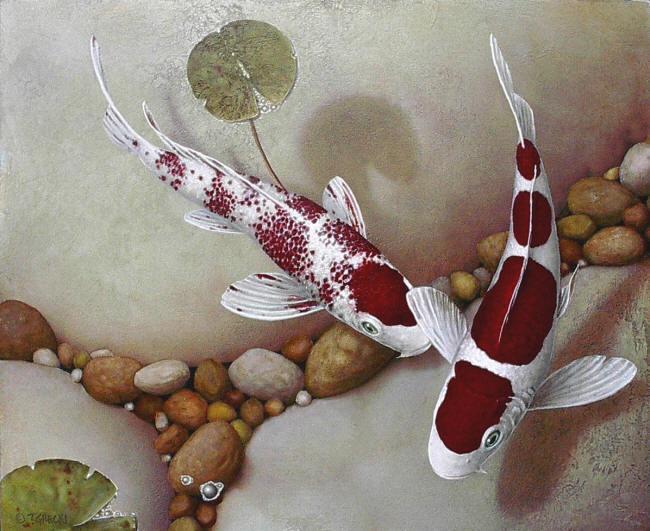 Удивительный художник Терри Жилецки больше всего любит рисовать карпов Кои. Он пленен их красотой, бесконечным разнообразием расцветок и узоров, и пытается в своих картинах разгадать секрет их притягательности.