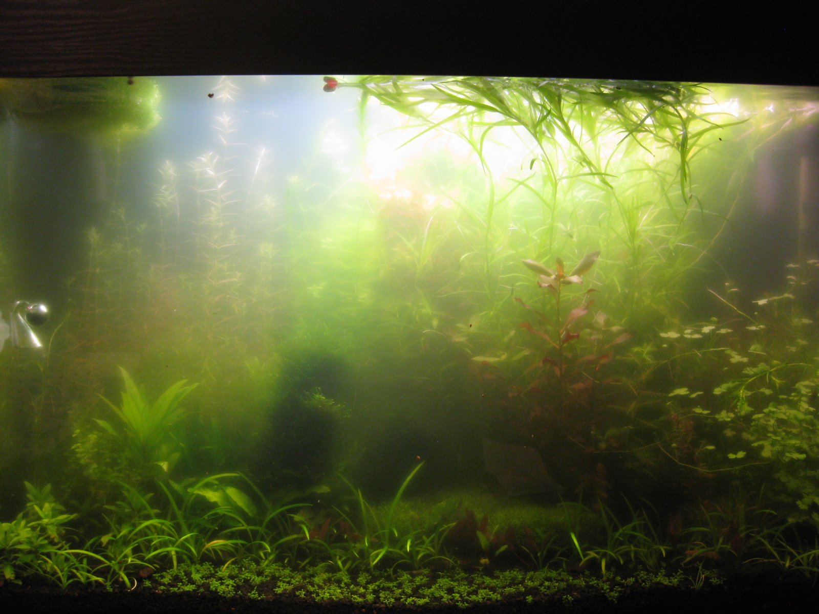 Сегодня сделал ещё одну подмену (50%) и включил свет на 3 часа. Вода развиднелась значительно, правда присутствует серенький туман, как при запуске бактериалка. Затемнение помогло однозначно, но думаю зелёный чаёк всё-таки тоже сделал своё дело (дубильные вещ-ва не очень нравятся зелёнке). На фото видно как полезла растючка вверх (междоузлия вытянулись), но тем не менее потерь нет, даже прибавка в весе. Особо радует островок риччии. А куба по размеру листа напоминает Хеми Микрантемоидес!  Сейчас буду тепеливо играться со светом. Потом, как очистится вода, дам СО2 и УДО чуть-чуть. В общем почти всё с начала, только преимущество уже у нас с растениями перед водорослями. надеюсь на скорый отлов баланса!