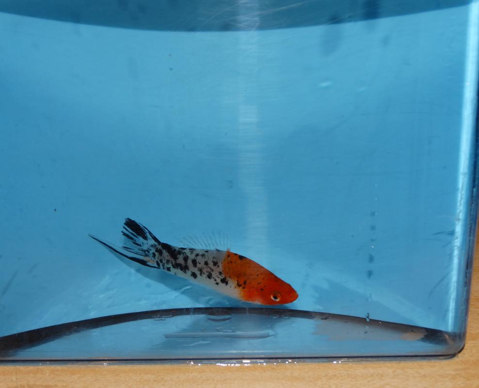 Я не думаю , что самец 4,5 переросток . Он правильно сложен с хорошим мечем . Просто флаговые самцы лилипуты , и по окрасу являются выбраковкой от санке . Правильный окрас санке это равномерный черный крап по корпусу окрашенному 50% на 50% в красный и белый цвет . Красный цвет может располагаться как у меченосца Кои Кохаку - хвост и голова , по середине корпуса опоясывающая белая лента , или Кои Кохаку/вариация Санта Клаус/ - на белом корпусе красная голова с ниспадающим красным на "плечи" , наподобии красного колпака у Деда Мороза , за что и получил прозвище Санта Клаус .