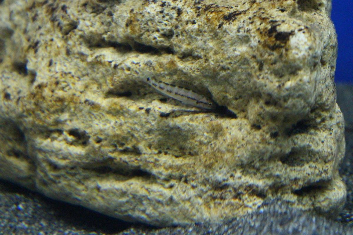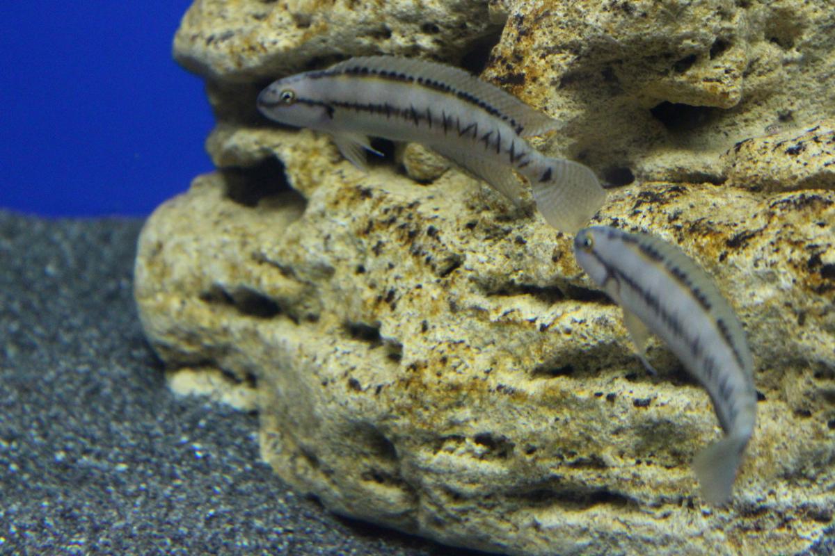 Julidochromis відігнавши Neolamprologus buescheri (на задньому фоні) позує для фото