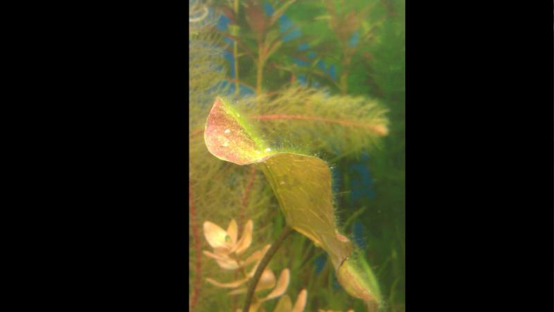 Меньше чем за неделю Олений рог затянул всю бликсу и эхинодорусы везувий. Механически очистить бликсу не удавалось. Развел перекись из расчета 40мл 3-х % на 50 л. Получилось что-то 0,003% на банку.