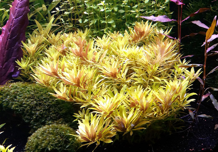 Верхняя часть листьев у растения салатного цвета, а нижняя с фиолетовым отливом, а сами листики имеет зазубринки похожими на те, которые мы видим, например, на ножовке по металлу. Высаживать растение желательно в центральной части аквариума. Любит яркое освещение, в этом случае его листья приобретут привлекательный красноватый цвет