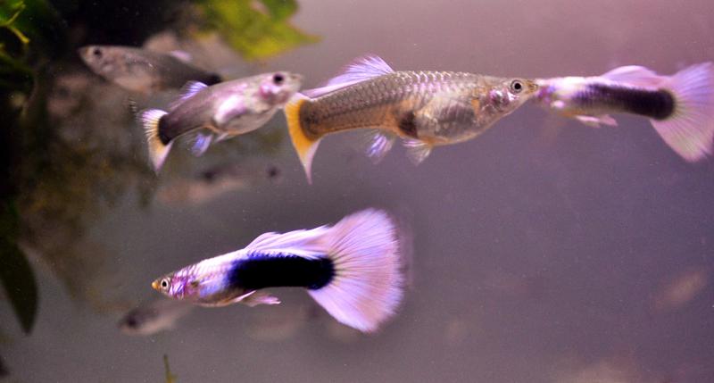 Ни одну рыбу толком не видно, точнее главного украшения гуппи - хвостового плавника. Понятно только что альбиносы..