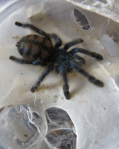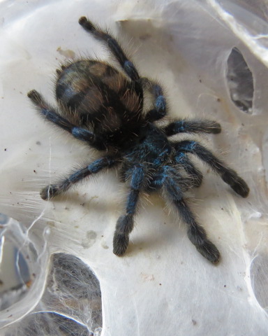 Avicularia versicolor самке 4 года.Подозрение вызывает темный карапас ,в то время как у моей молодой самки он бирюзового цвета.Зависит ли это от возраста или паук может быть гибрид?Нормально ли это?