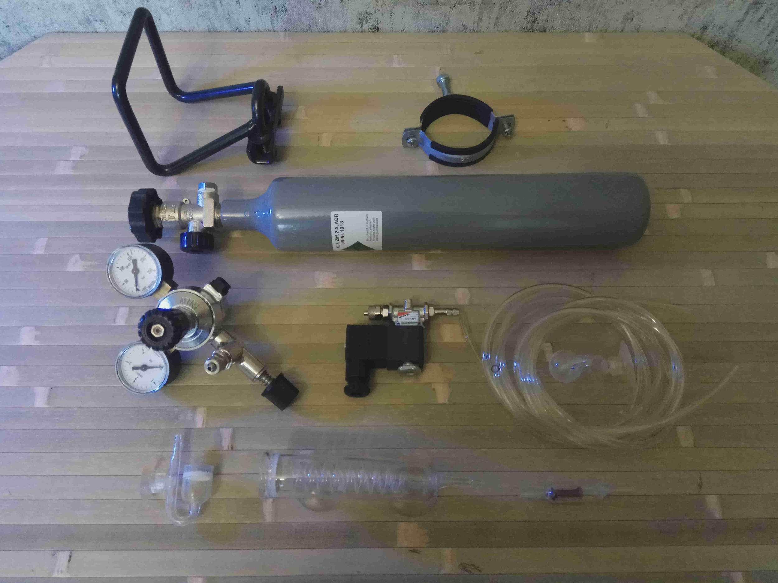 Электроклапан Camozzi новый. Для работы нужен только таймер и кабель с вилкой для электроклапана. У баллона сорван клапан, видно на фото – заменен болтом (клапана в продаже не нашел). У большого диффузора отбит кончик на конце спирали, на работу не влияет. Маленький диффузор, стеклянный клапан, дропчекер в подарок.