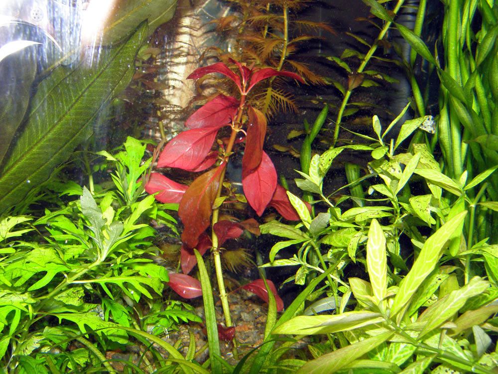Верхняя часть листьев у растения салатного цвета, а нижняя с фиолетовым отливом, а сами листики имеет зазубринки похожими на те, которые мы видим, например, на ножовке по металлу. Высаживать растение желательно в центральной части аквариума. Любит яркое освещение, в этом случае его листья приобретут привлекательный красноватый цвет