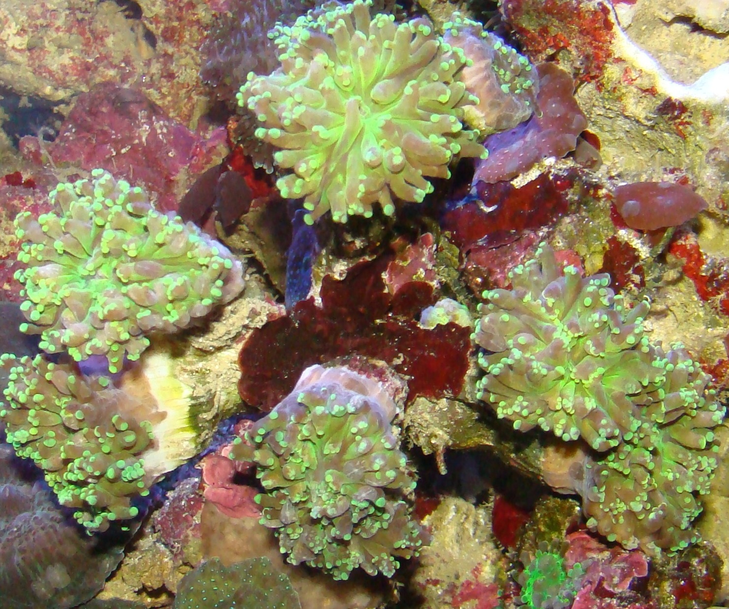 На данный момент из кораллов 4 вида зонтиков, монтипора, акропора, бриареум, паразоантус, ксения розовая, белая, родактис, просто они маленькие не разрослись, ползают еще 2 стромбуса.