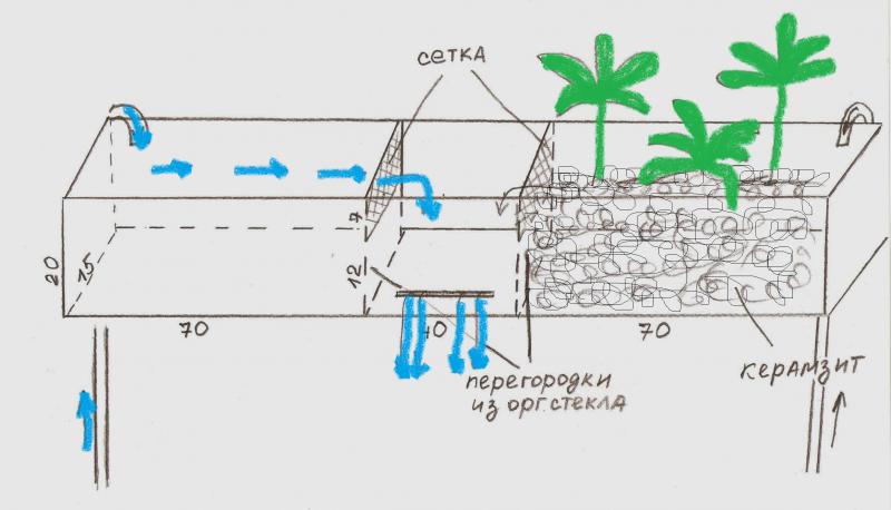 Параллельно шло "заселение" фито-фильтра: керамзит (30л), цветы в индивидуальных сетчатых корзинках (хотела купить прудовые, не нашла - пришлось самим паять)