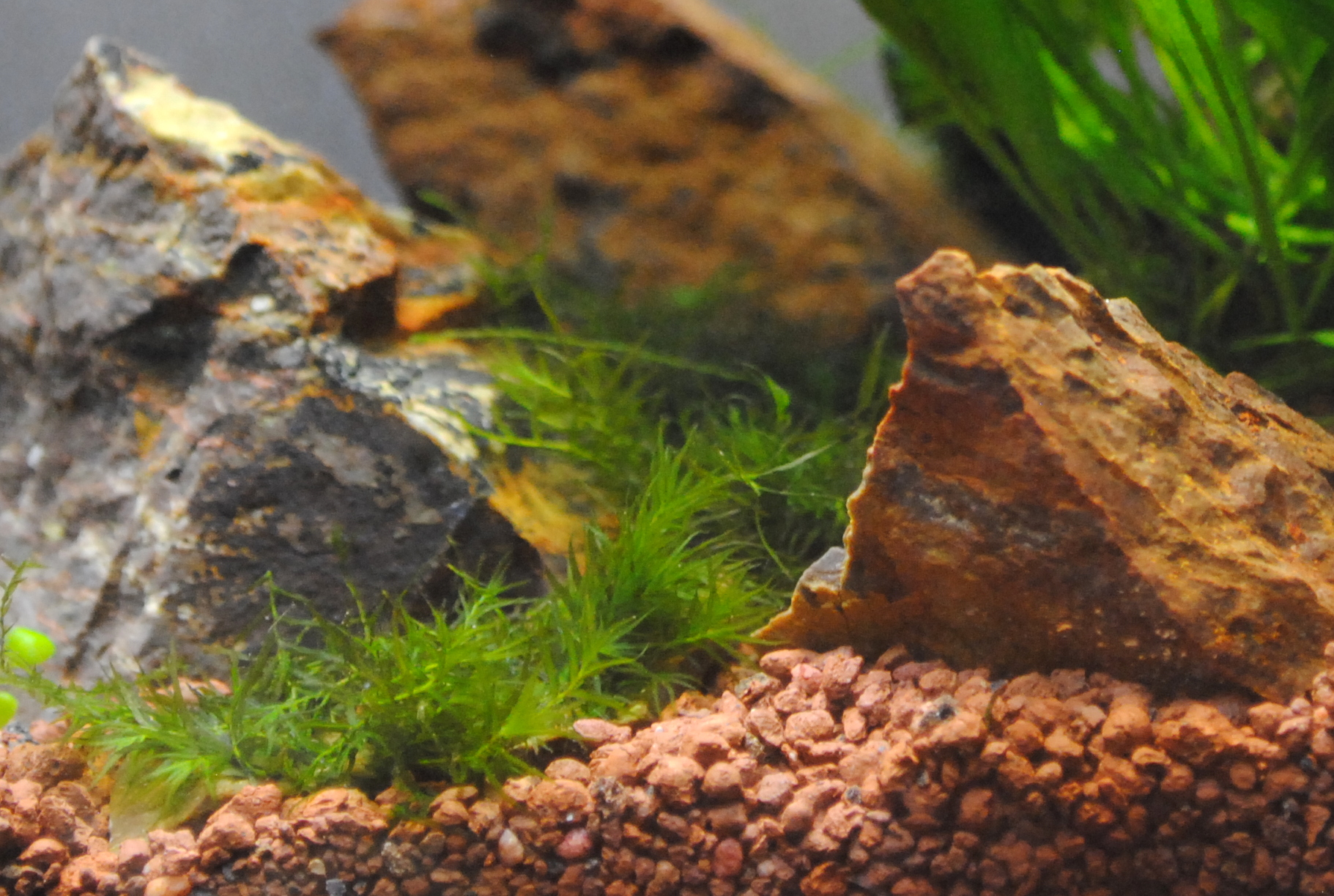 Композиция получилась сама собой... Камни оказались настолько интересными и по форме и по цвету, что душа просто пела, а руки сами собой выкладывали искомую картинку. Не уверен в названиях, но все же рискну. За основу был взят "остров", но не просто остров, а остров ивагуми, с "розеткой" из камней, внутри которой должен был разметится папоротник и и гигрофила кринкленд, несущие основную визуальную нагрузку. Окружать сию конструкцию должен мох фисиденс и стринги, ну и совсем немного почвопокровки... Осталось самое малое - дождаться фотографа с фотоаппаратом. И он пришел...