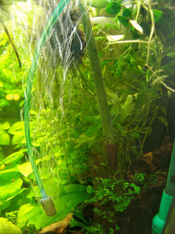 - Третий (на фото нет) "посадил" в домашний цихлидник (t=26С; рН=6,5; КН=4; gH=16). Взял половину 0,5л пластиковой бутылки, наделал отверстий, засыпал мелким кварцем со дна аквариума и посадил туда мангр. Всю конструкцию прикрепил проволокой к заднему стеклу - над водой 1/3 торчит.